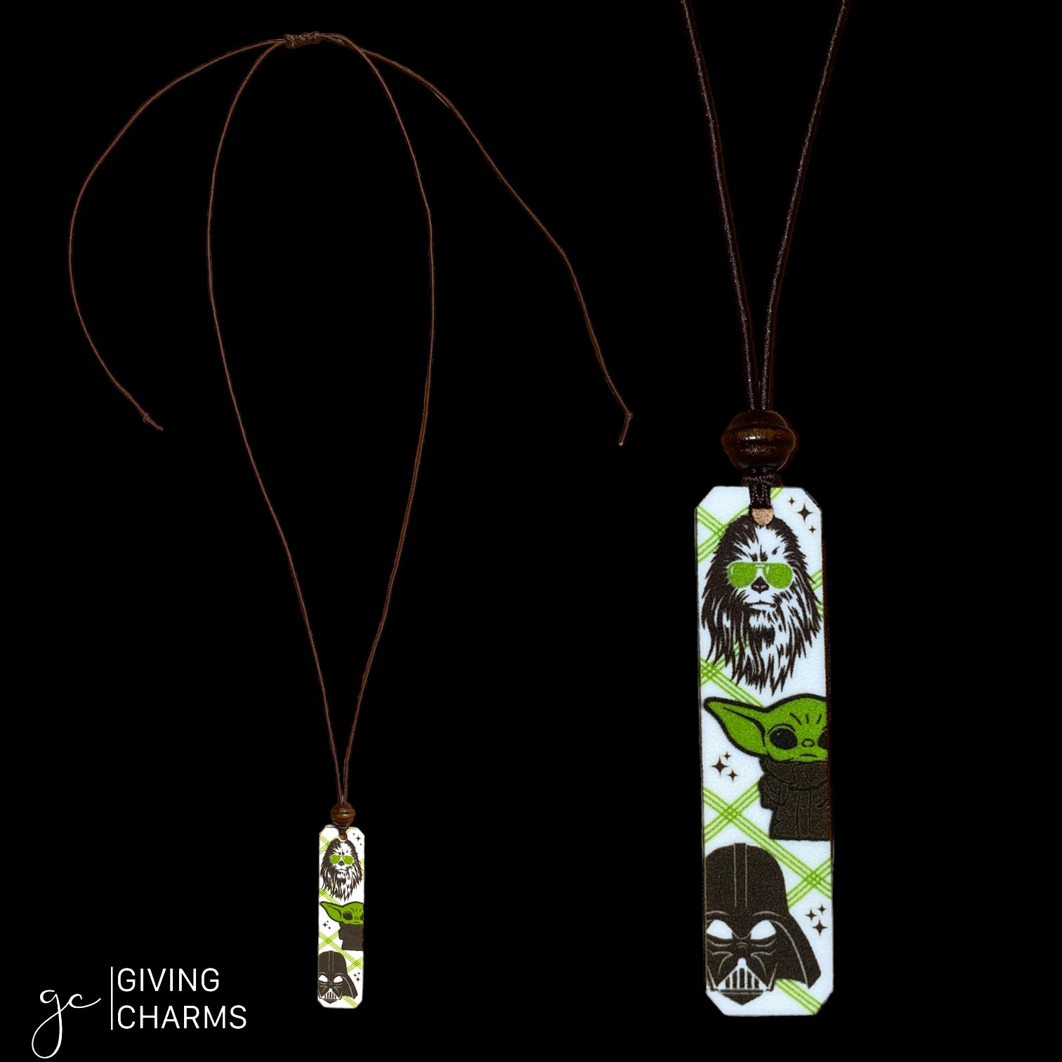 This necklace feature an adjustable elastic necklace cord and a beautiful Star Wars inspired charm. Great for kids and adults.