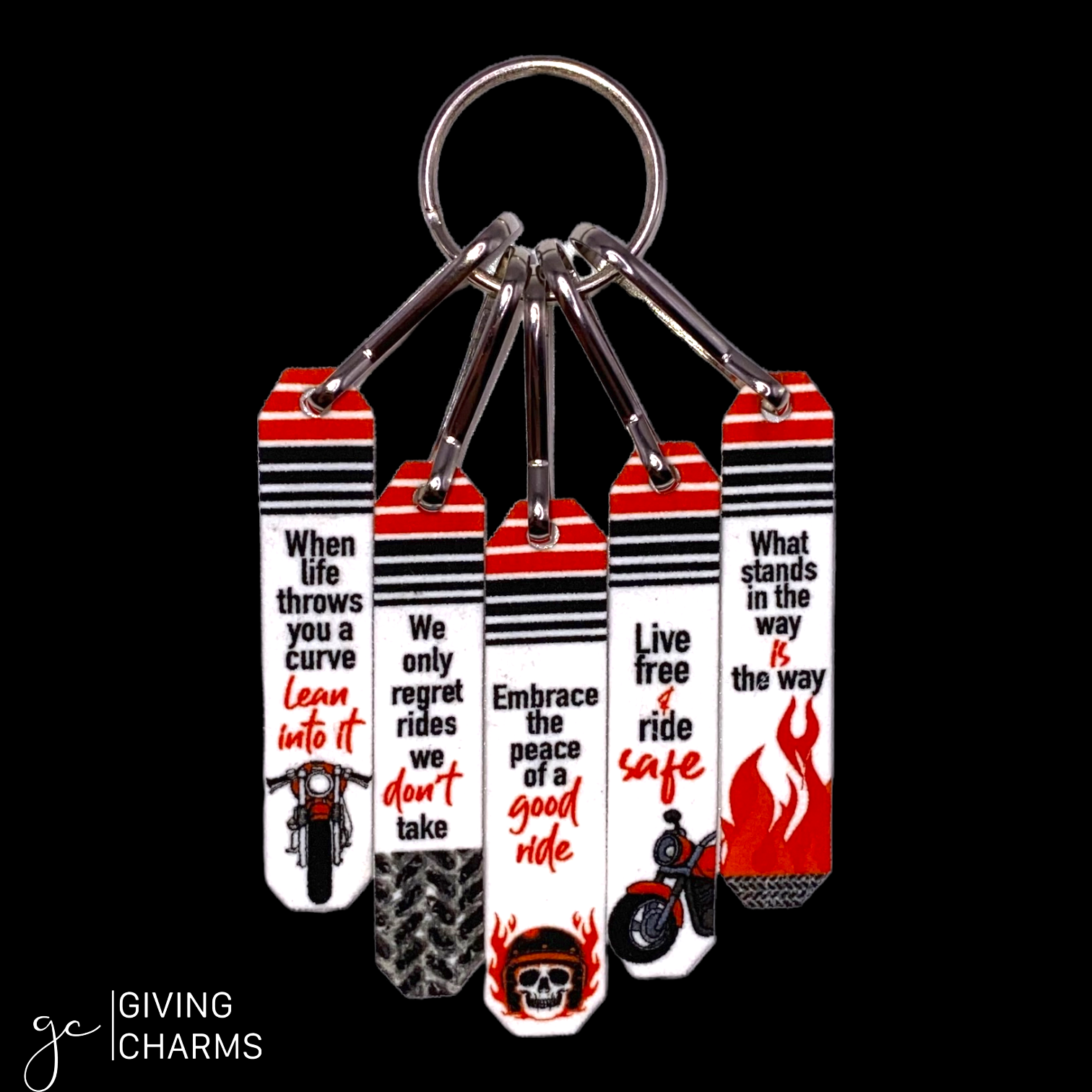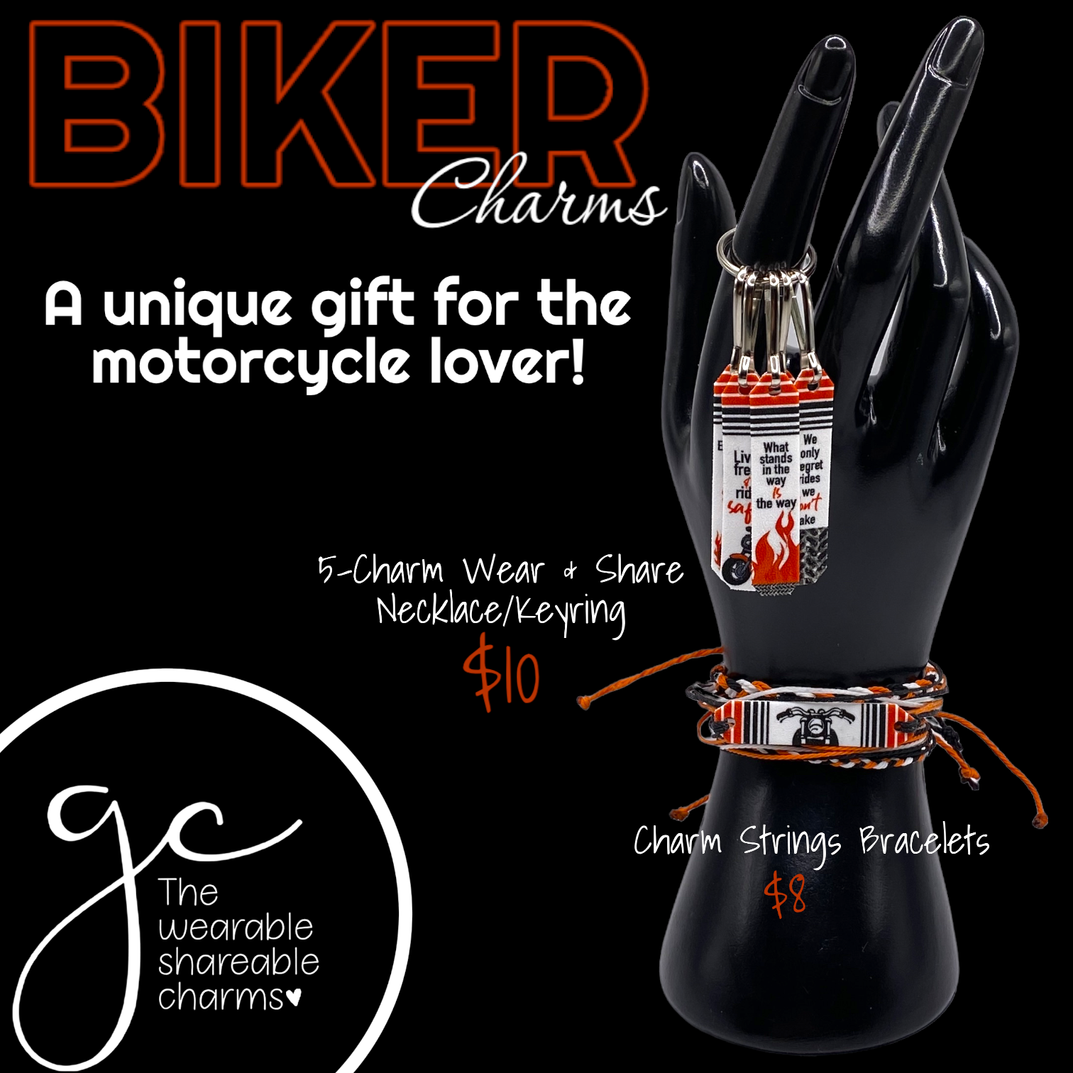 Let’s face it, there’s not a lot of gifts you can get a motorcycle lover that they’ve never heard of or doesn’t cost an arm and a leg. ALAS - here’s your answer! This set features 5 shareable charms on a silver Keyring. Optional  20” black wax necklace also included.