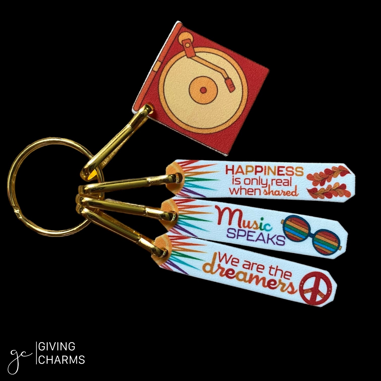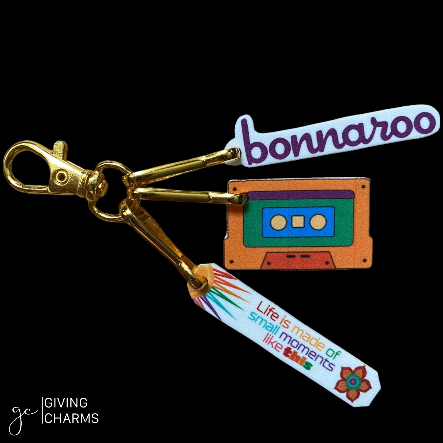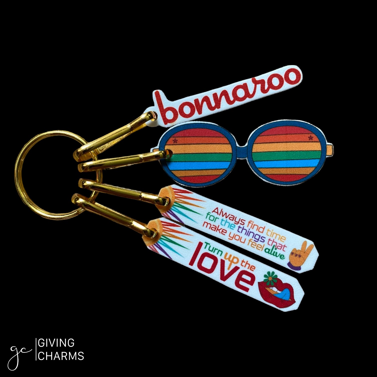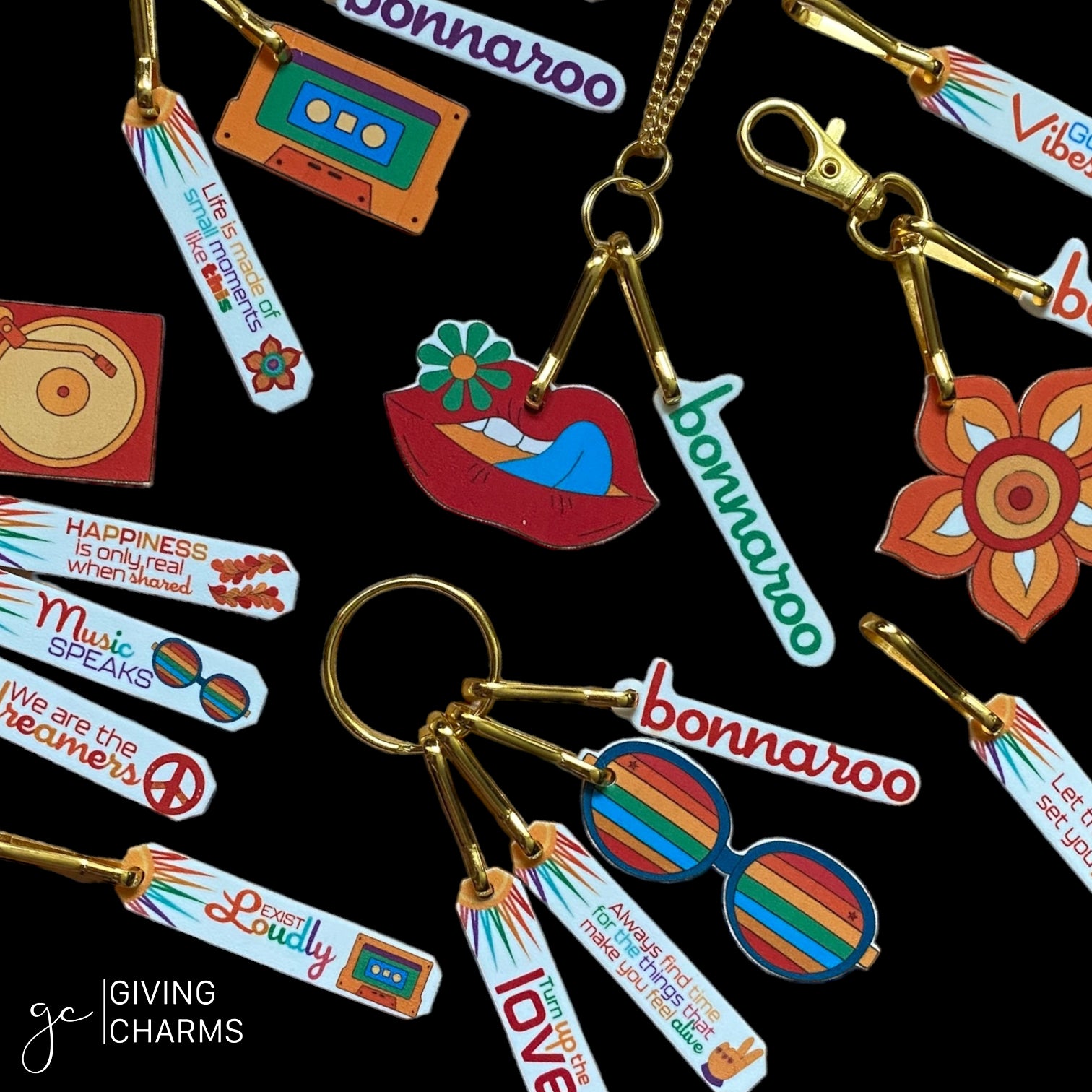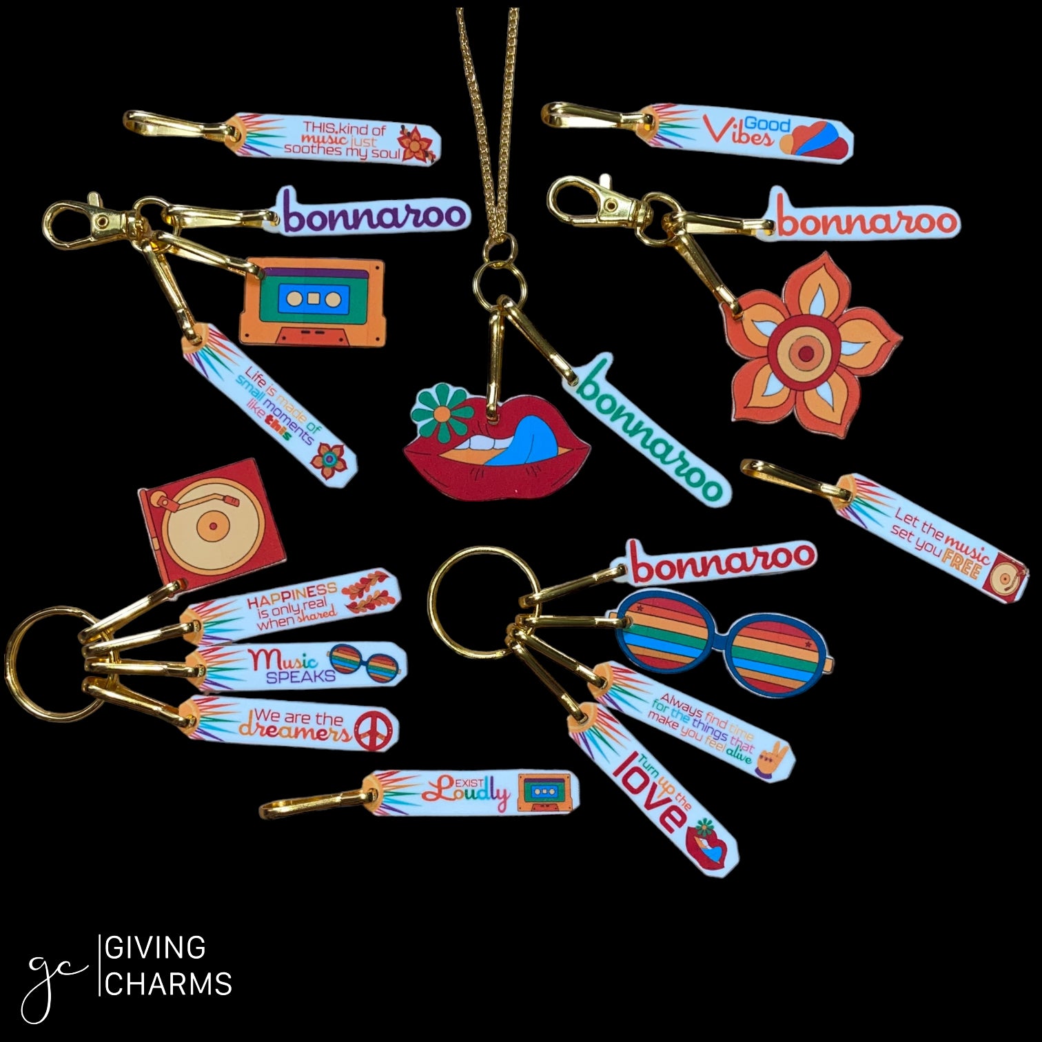 The perfect addition to your Bonnaroo attire! This set includes 2 charms (one “Bonnaroo” charm & one large graphic charm) clipped to a Key Clip, Keyring, or Necklace. Charms can be unclipped & shared. Please note, individual wear & share charms are not included, but can be purchased as The Bonnaroo Tin.
