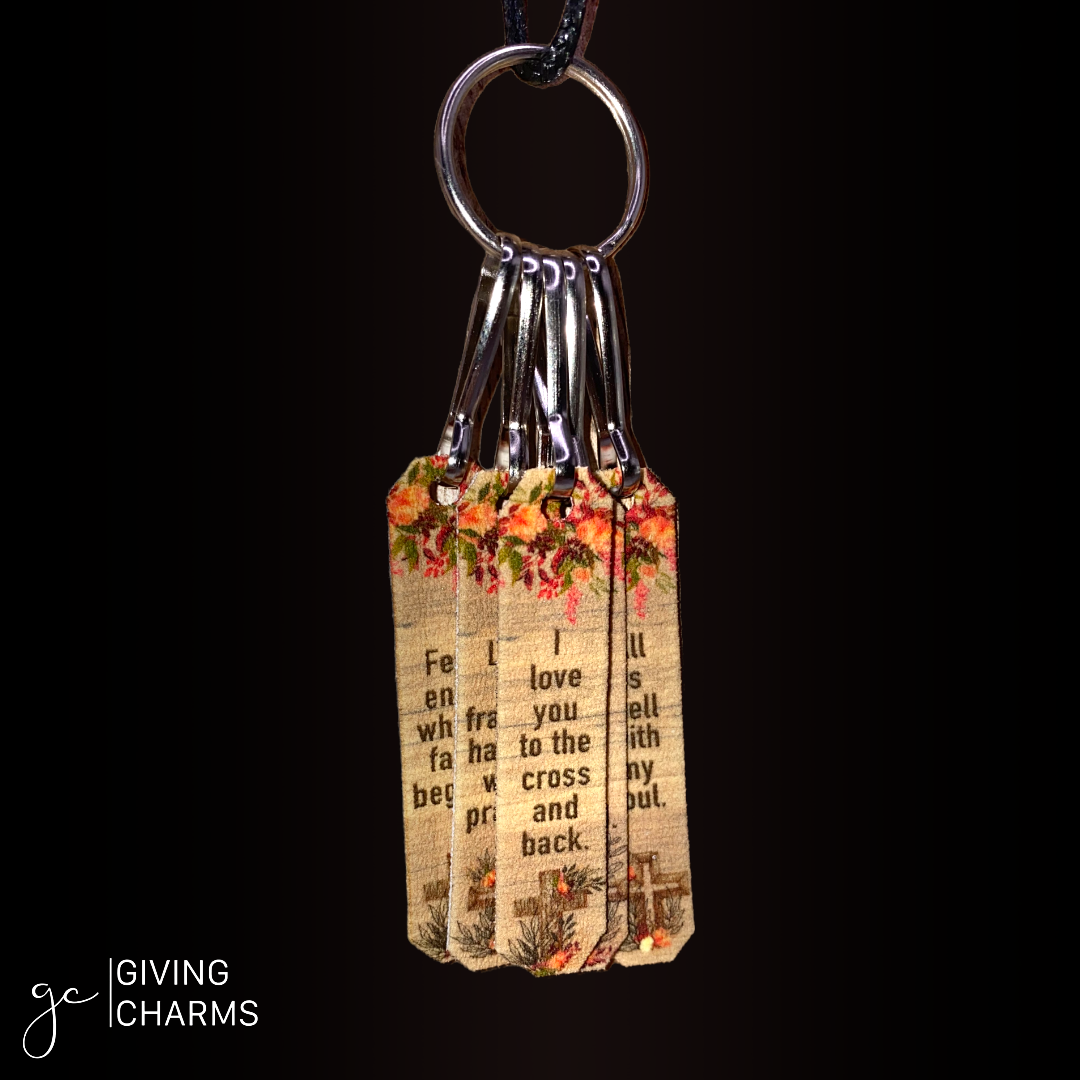 This set features 5 shareable charms attached to a silver loop on a 20" black wax necklace. Matching Charm Strings Bracelets available. *Disregard the necklace to use as a keyring!