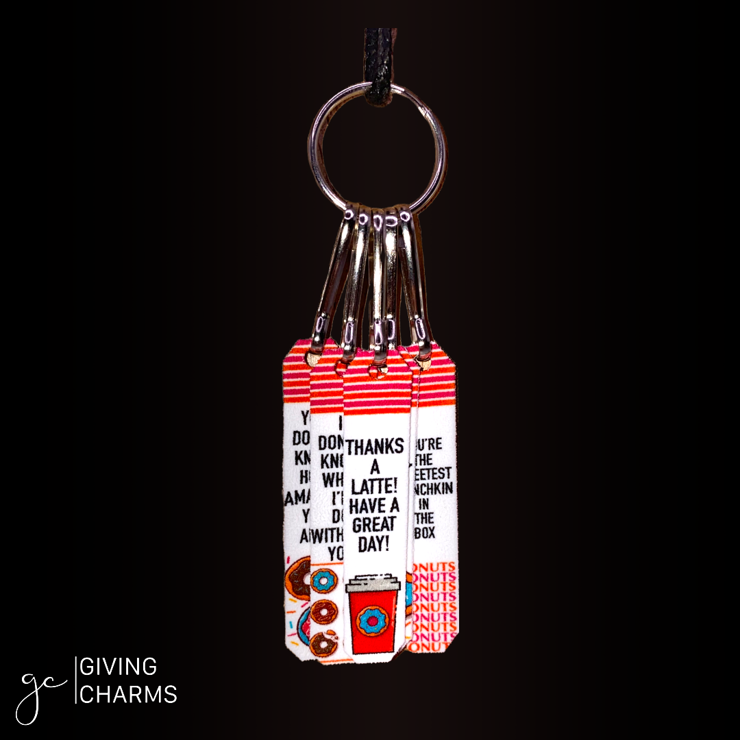 This set features 5 shareable charms attached to a silver loop on a 20" black wax necklace. Great to hang off your rearview mirror & tip when you go through the drive-thru *Disregard the necklace to use as a keyring!
