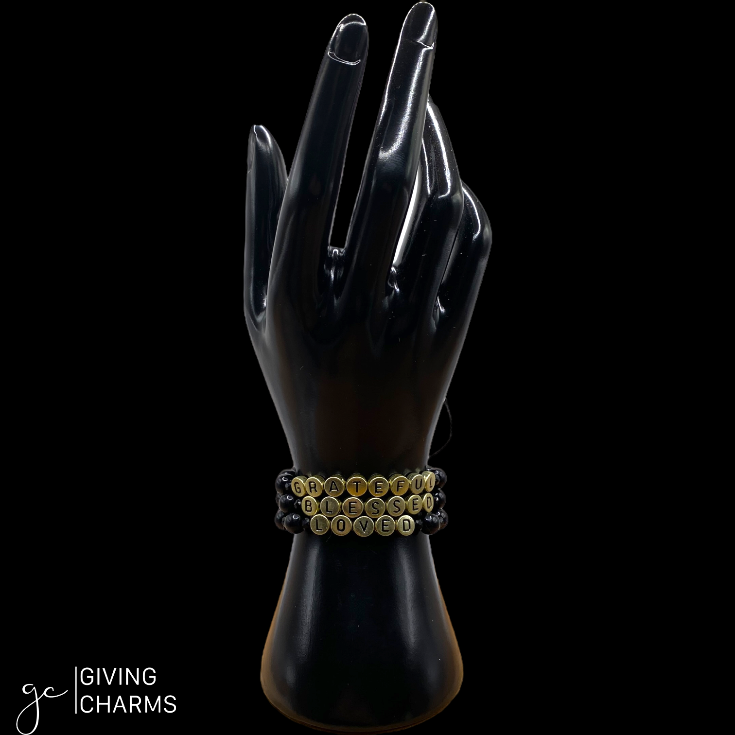 These classy adjustable Letter Bead Bracelets fit wrists big or small. Choose your phrase below or request a custom phrase by emailing givingcharms@gmail.com.