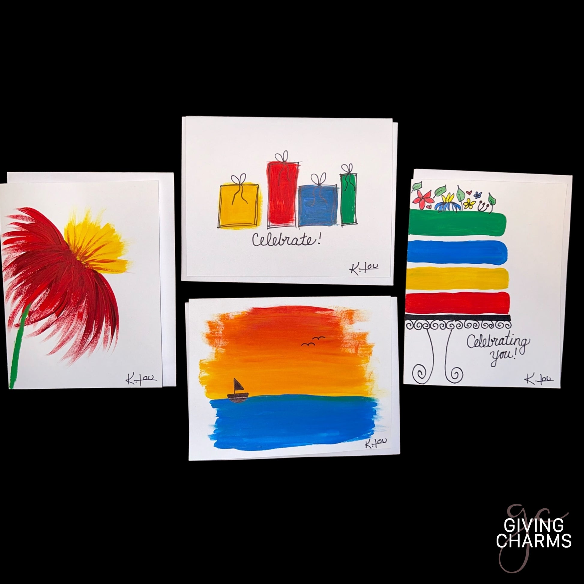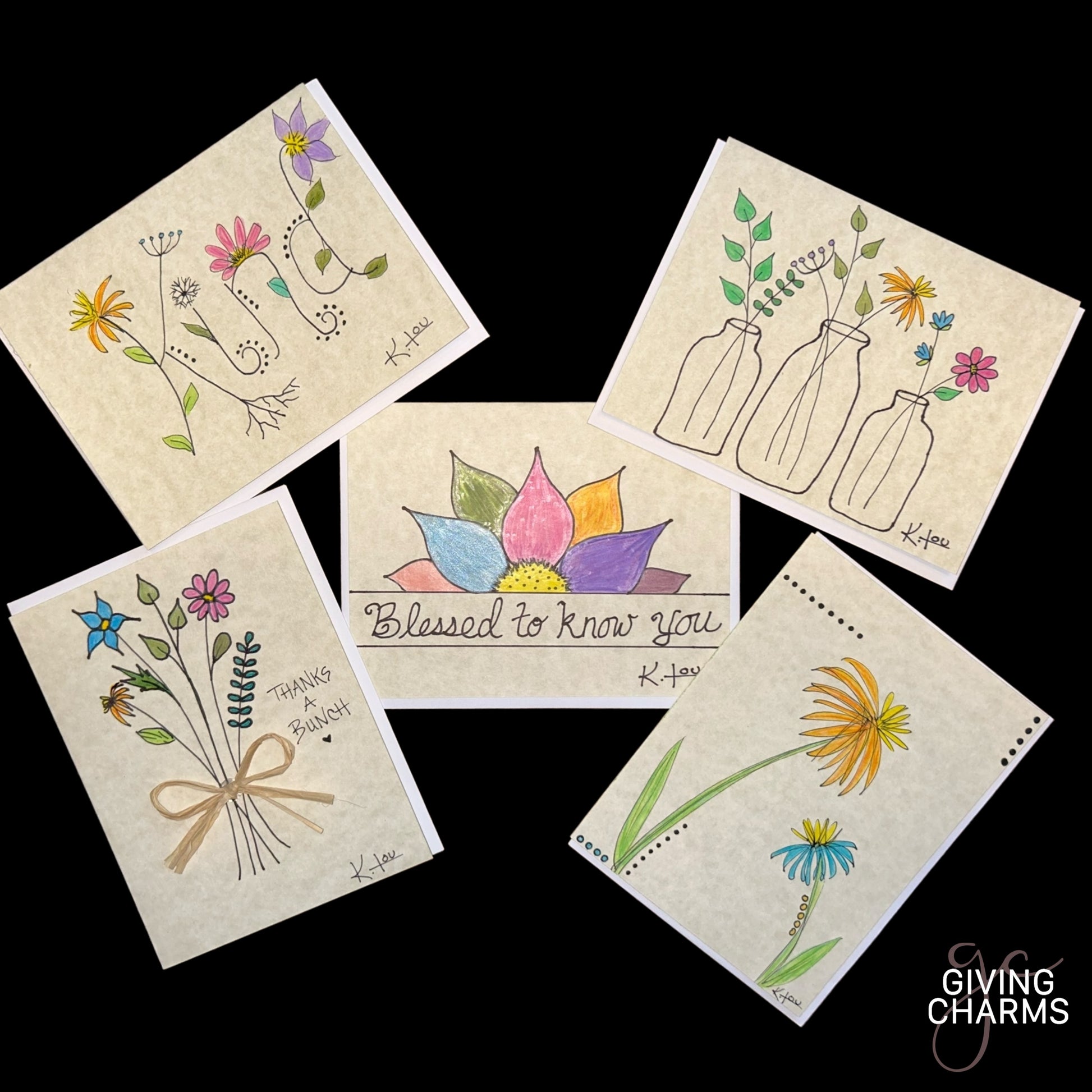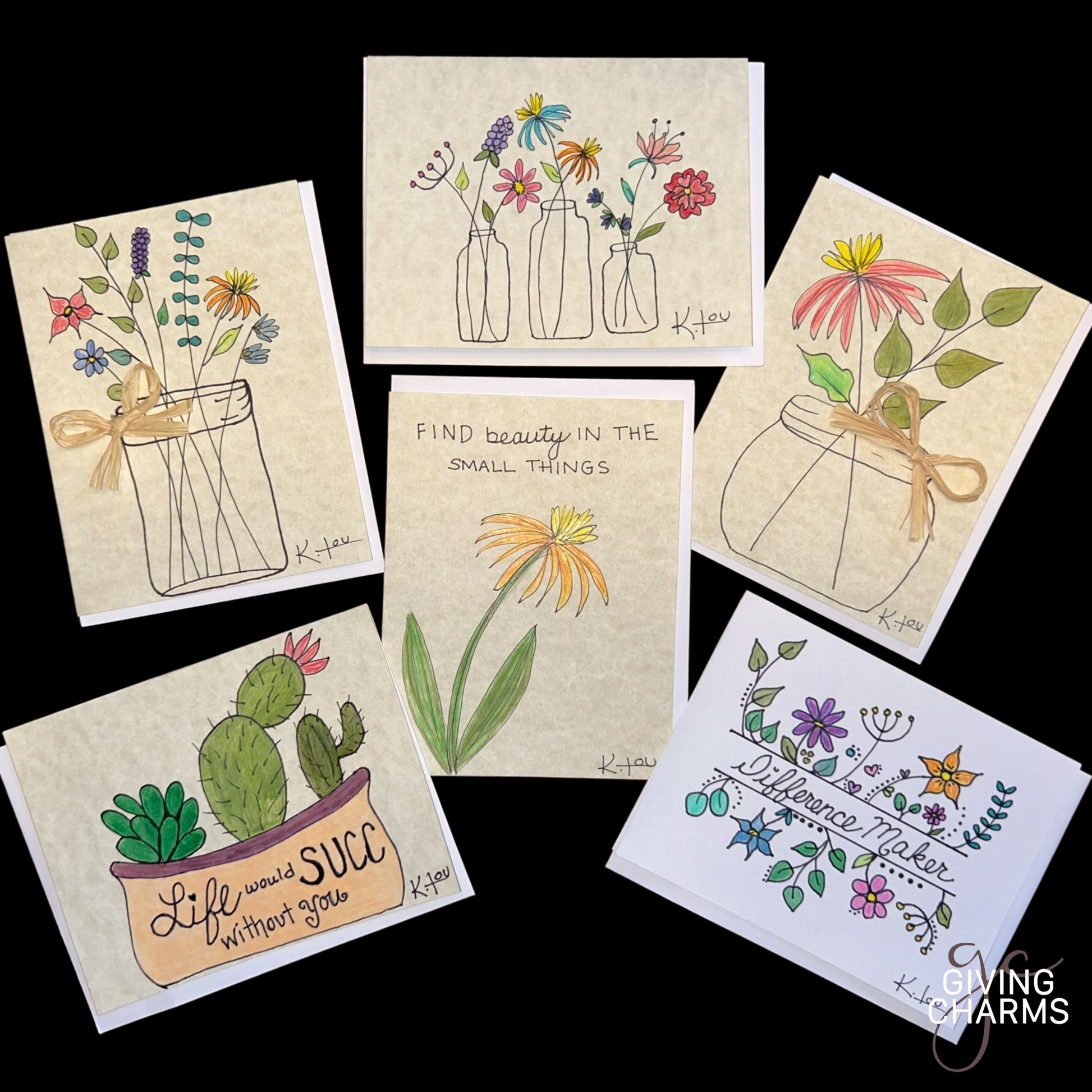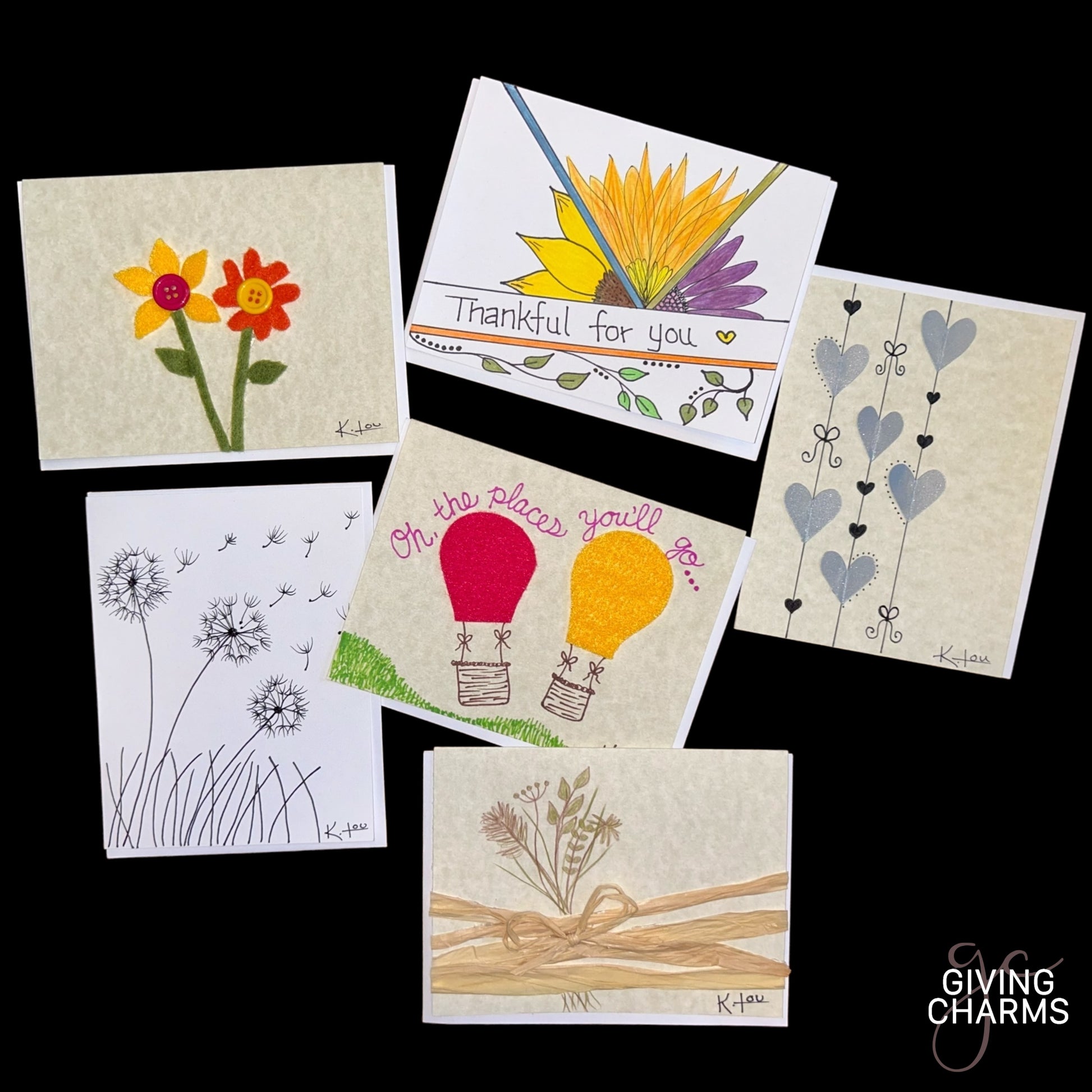 These cards are handmade with love and completely unique! Each variety pack comes with your choice of 5 or 10 greeting cards. If you’d like a particular card included in your pack, please email givingcharms@gmail.com after completing your order and we’ll be happy to accommodate.
