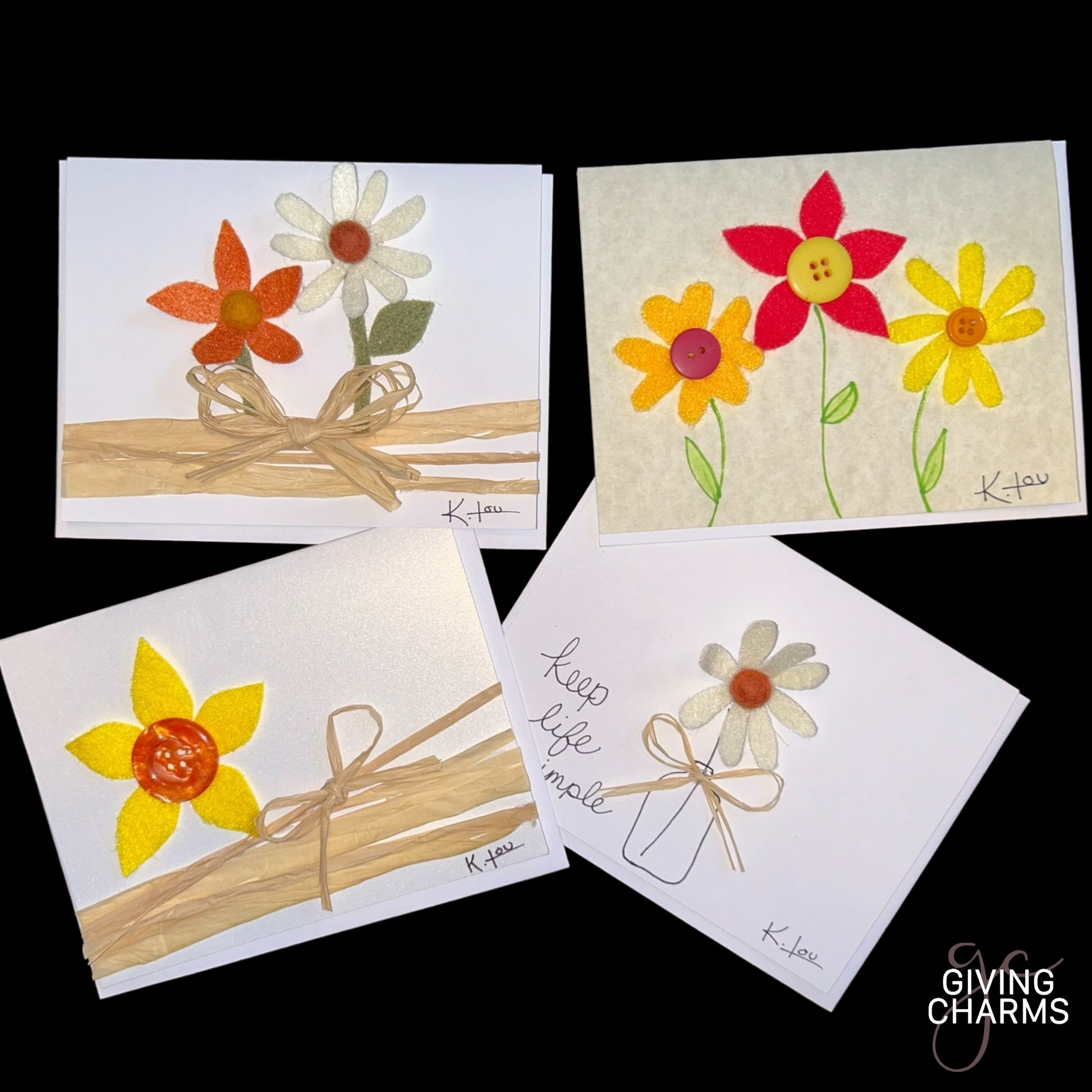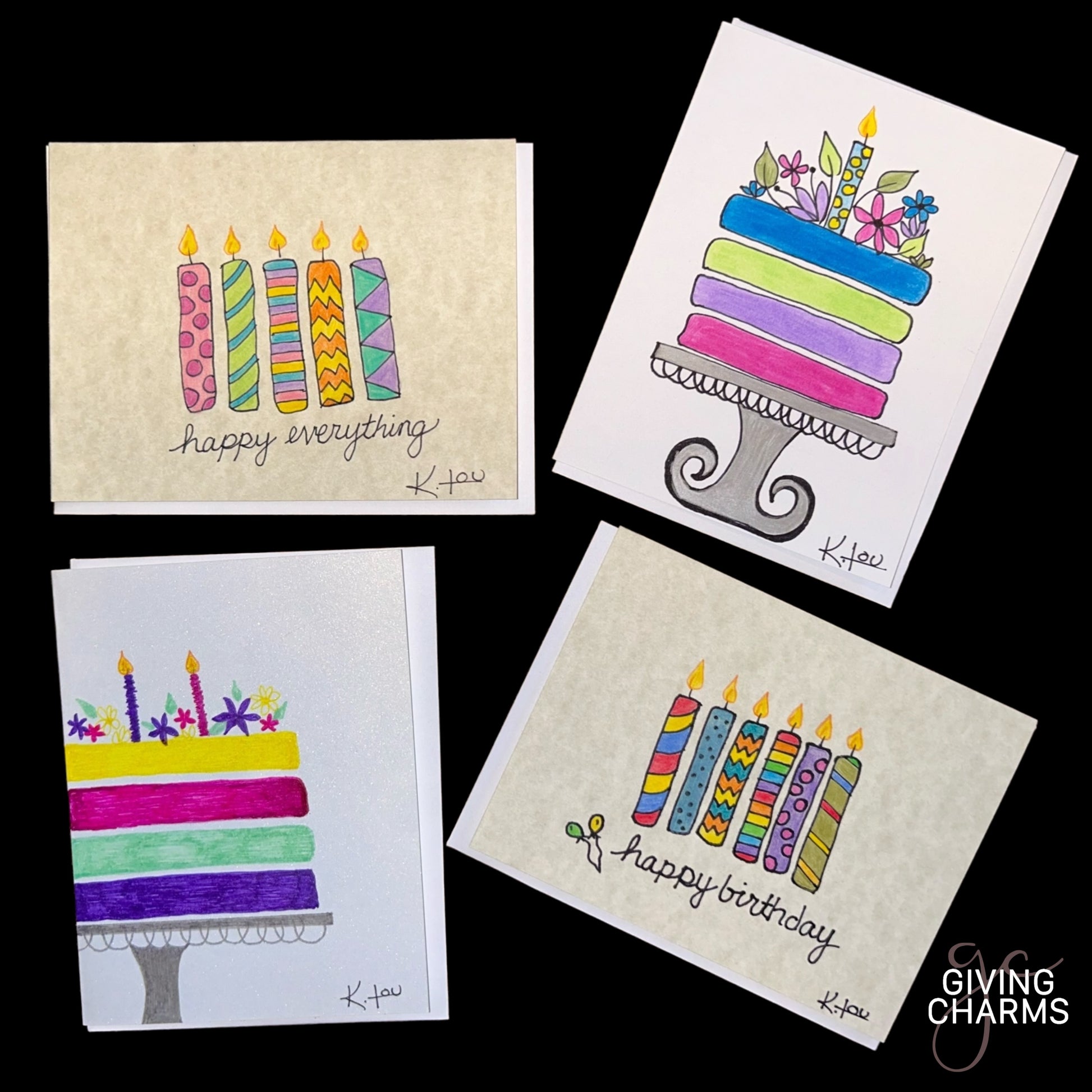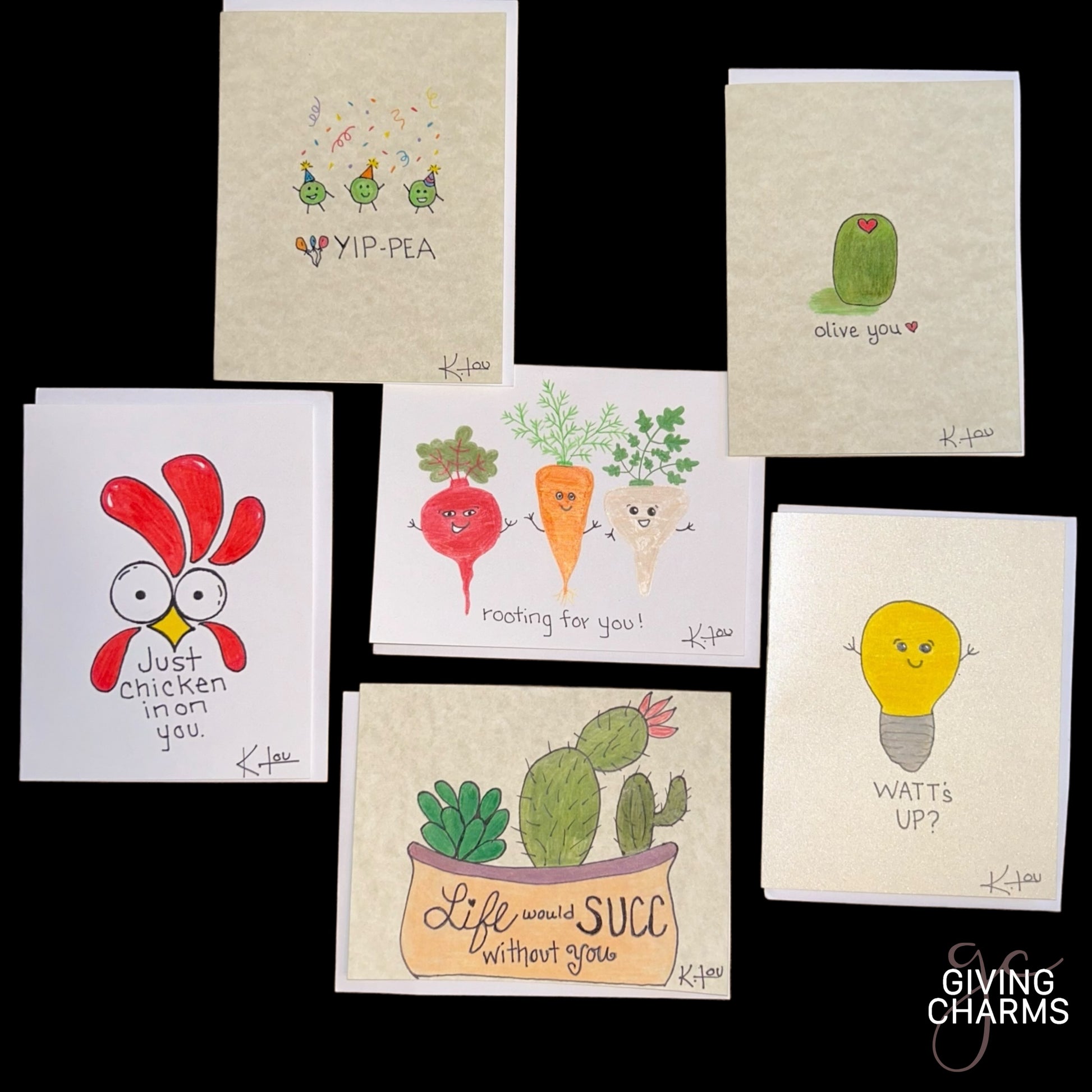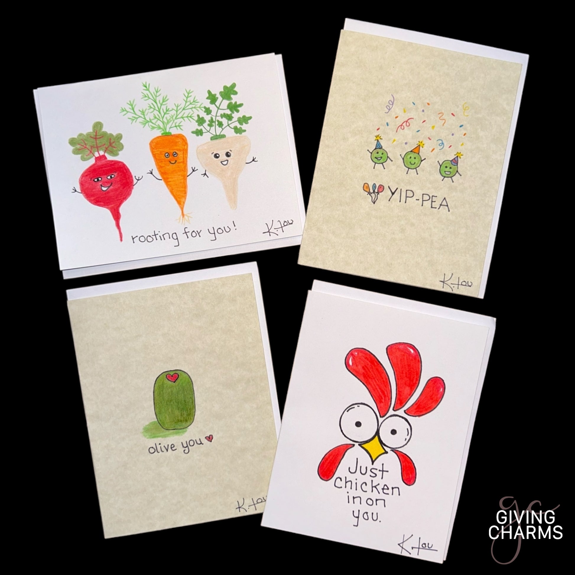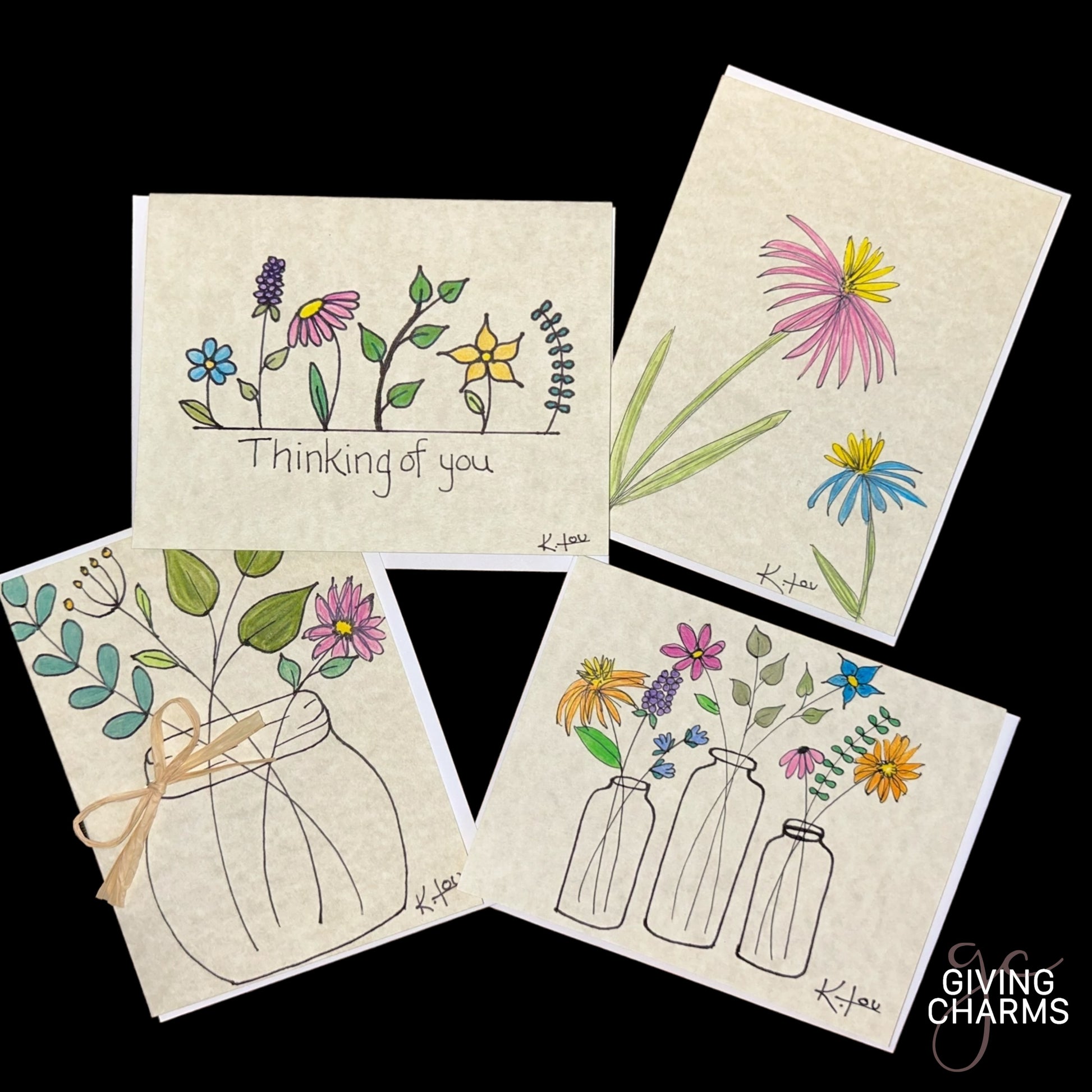 These cards are handmade with love and completely unique! Each variety pack comes with your choice of 5 or 10 greeting cards. If you’d like a particular card included in your pack, please email givingcharms@gmail.com after completing your order and we’ll be happy to accommodate.