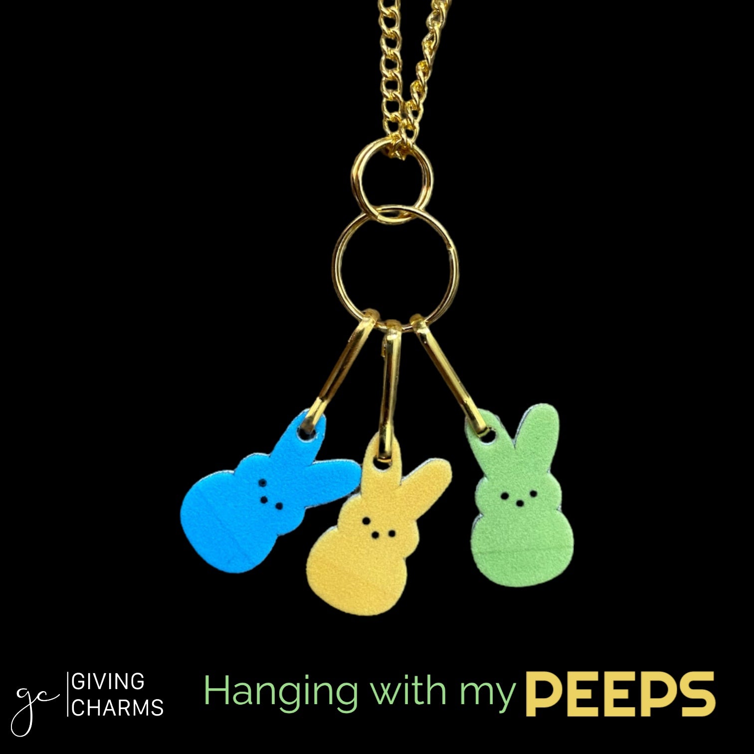 This adorable necklace is perfect for Easter! It features 3 wear and share peep charms on a gold loop attached to a 24” gold chain necklace. Matching Earrings also available!