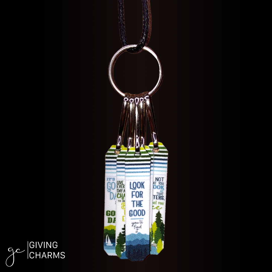 This set features 5 shareable charms attached to a silver loop on a 20" black wax necklace. Matching Charm Strings Bracelets, Earrings & Sticker Charms also available. *Disregard the necklace to use as a keyring!