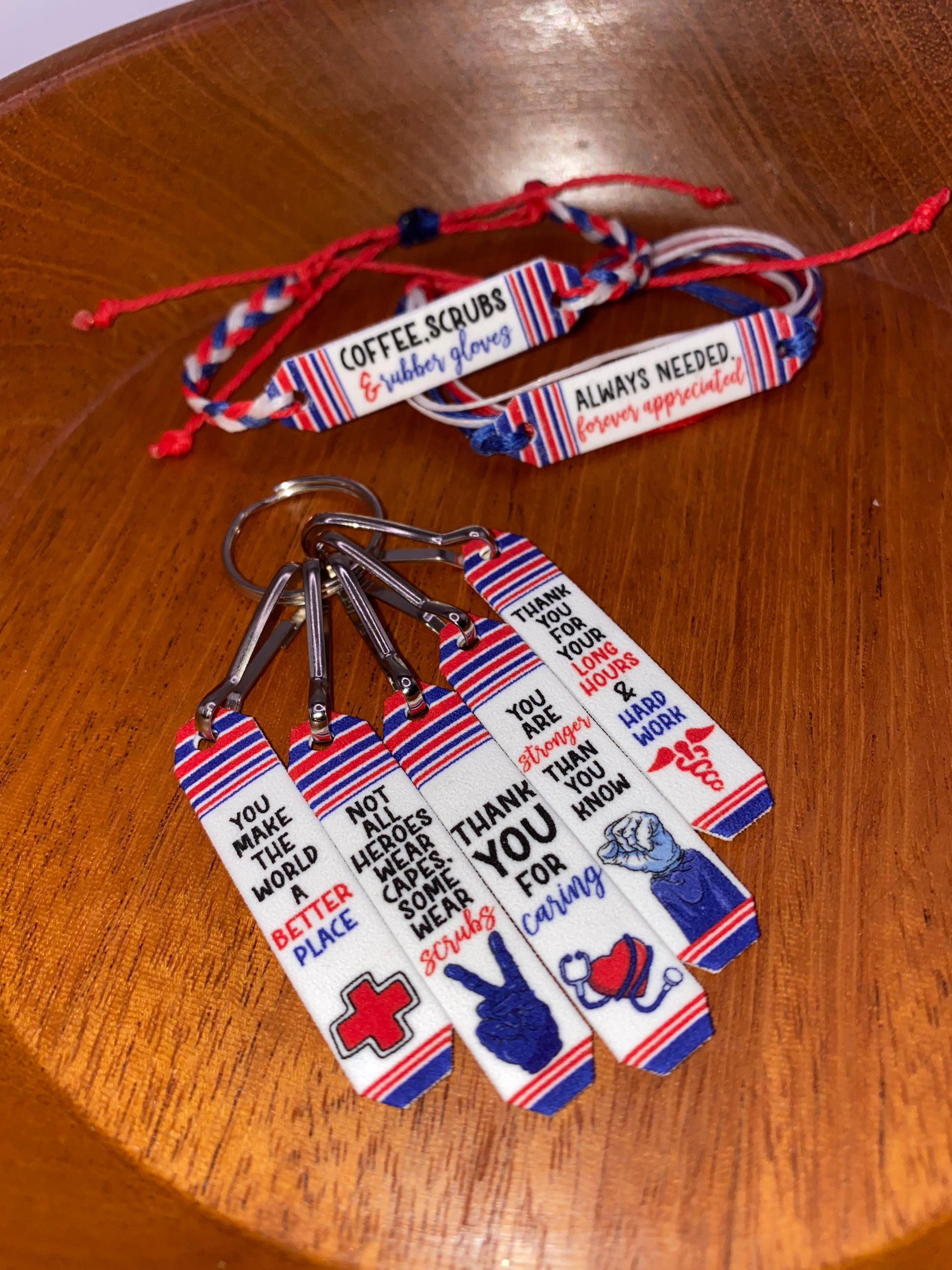 This set features 5 shareable charms attached to a silver loop on a 20" black wax necklace. Great for anyone in the medical community. Also wonderful to wear to an apartment & give! Matching Charm Strings Bracelets available. *Disregard the necklace to use as a keyring!