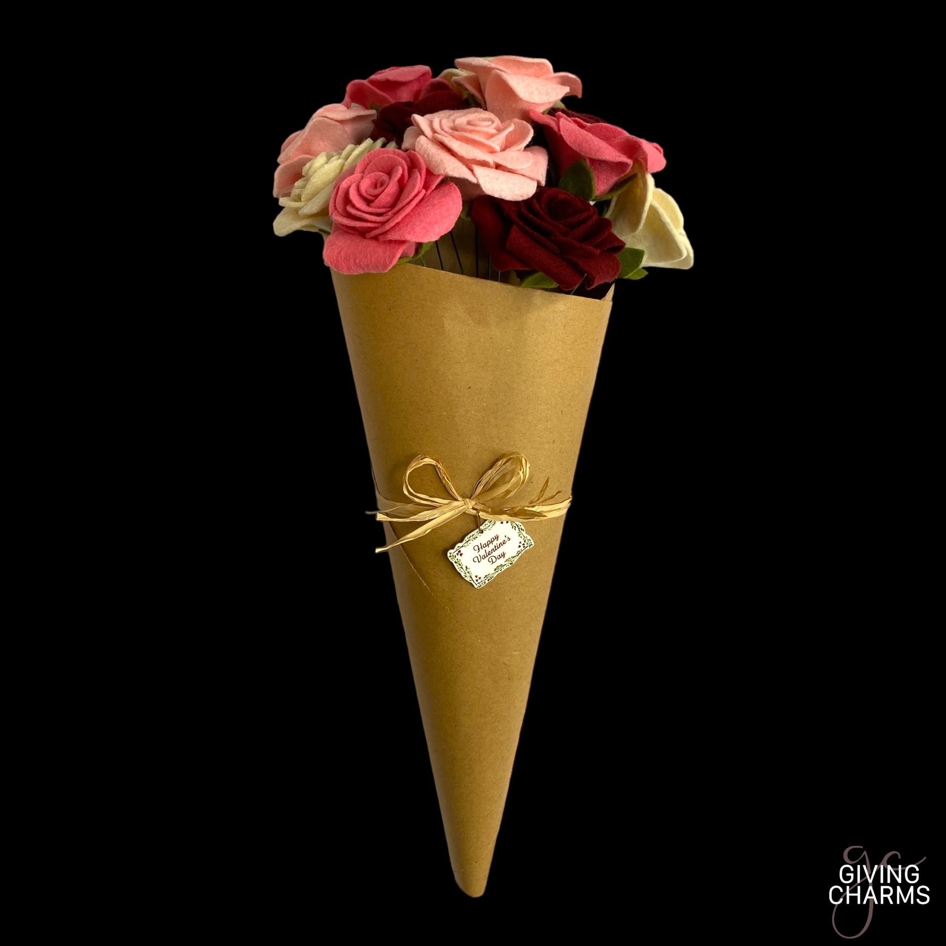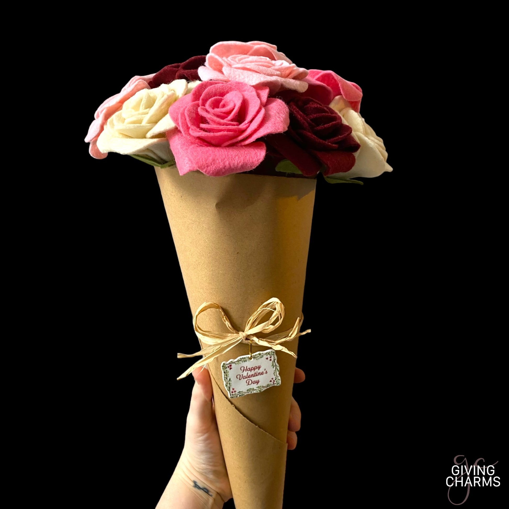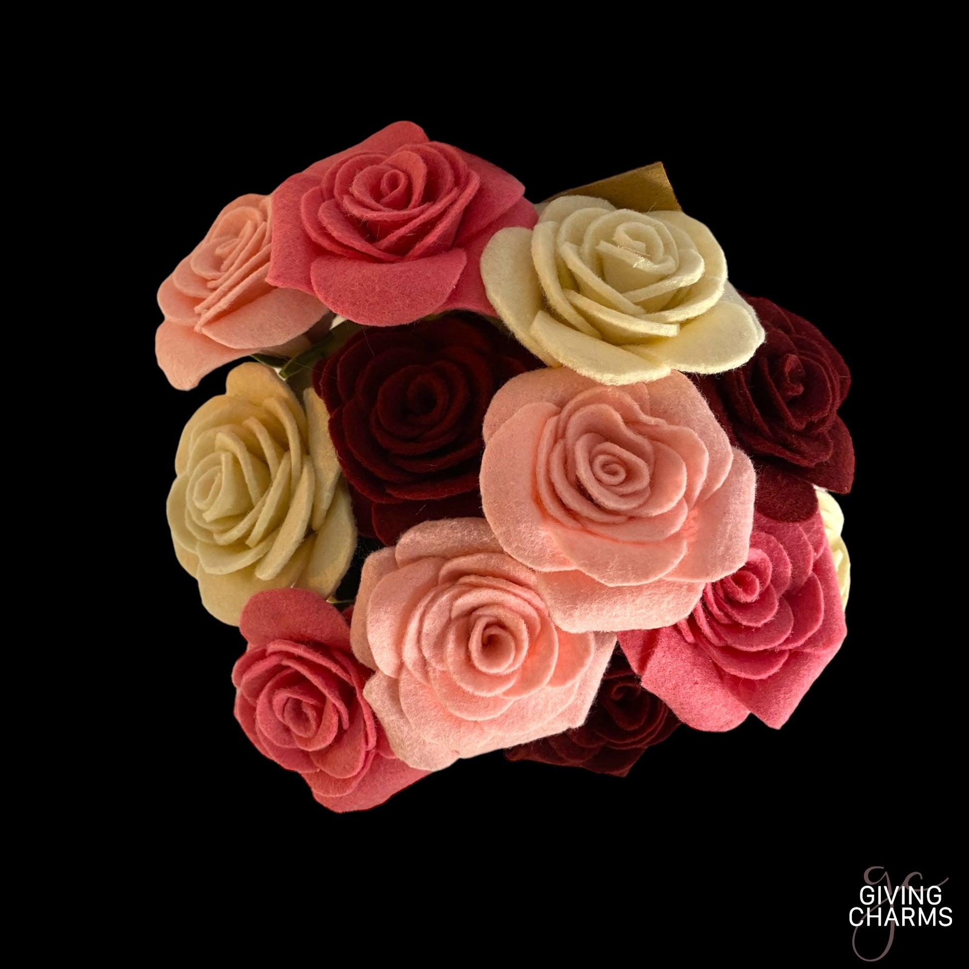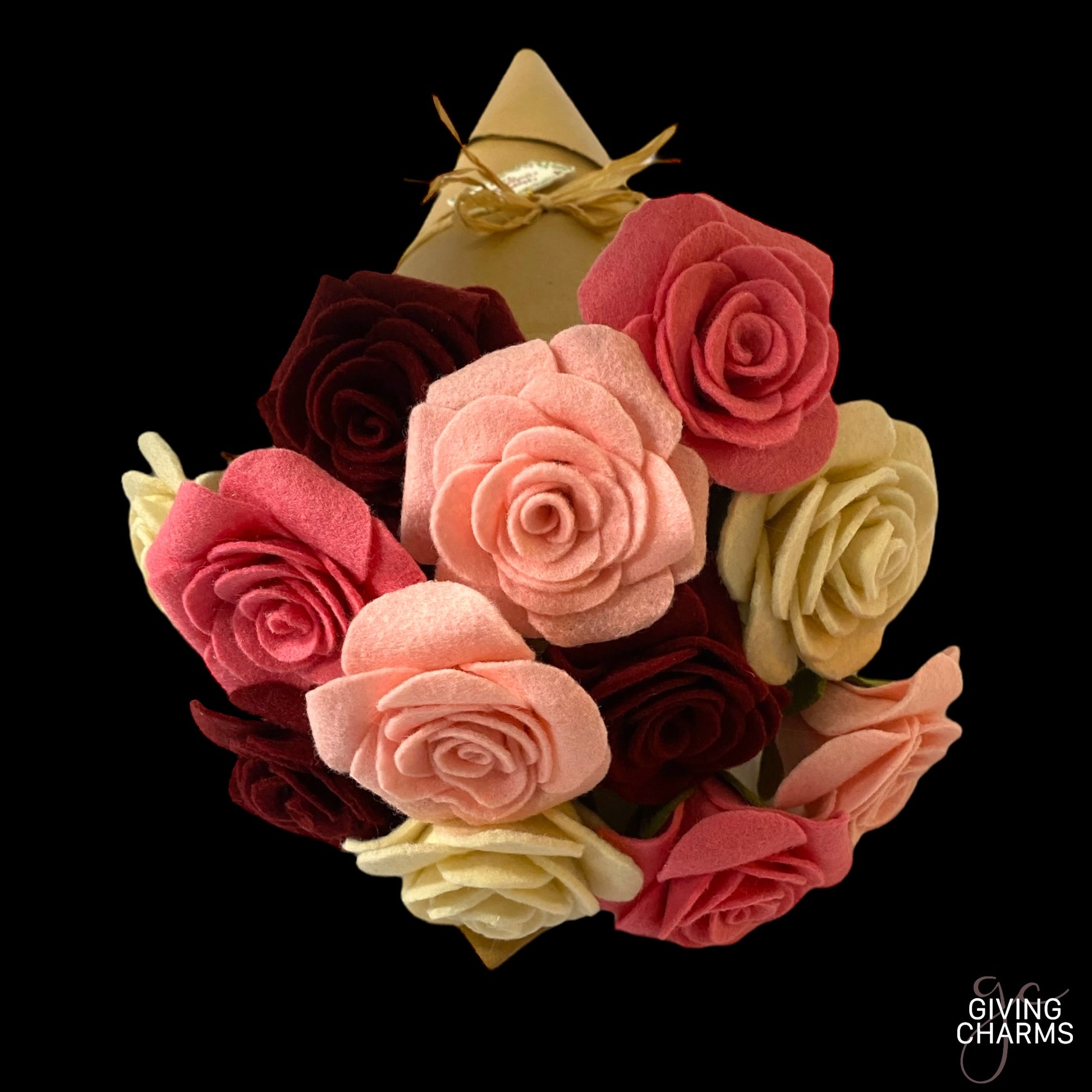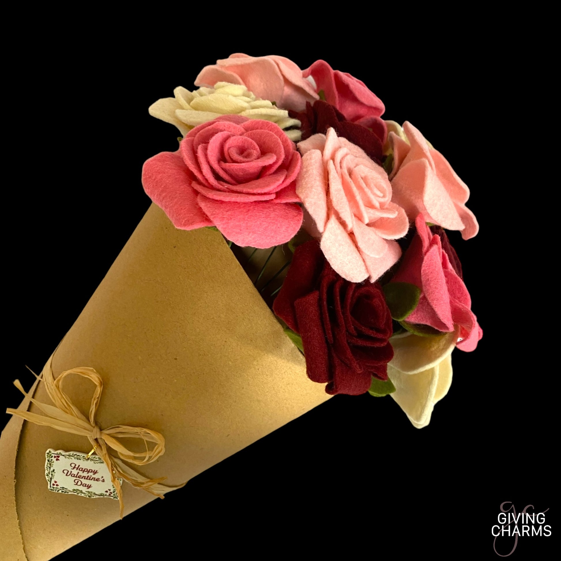 This particular bouquet features 12 roses (pink, light pink, ivory & dark red). Add eucalyptus greenery for a small fee. The bouquet comes wrapped in craft paper with a raffia bow & a charm of your choice!