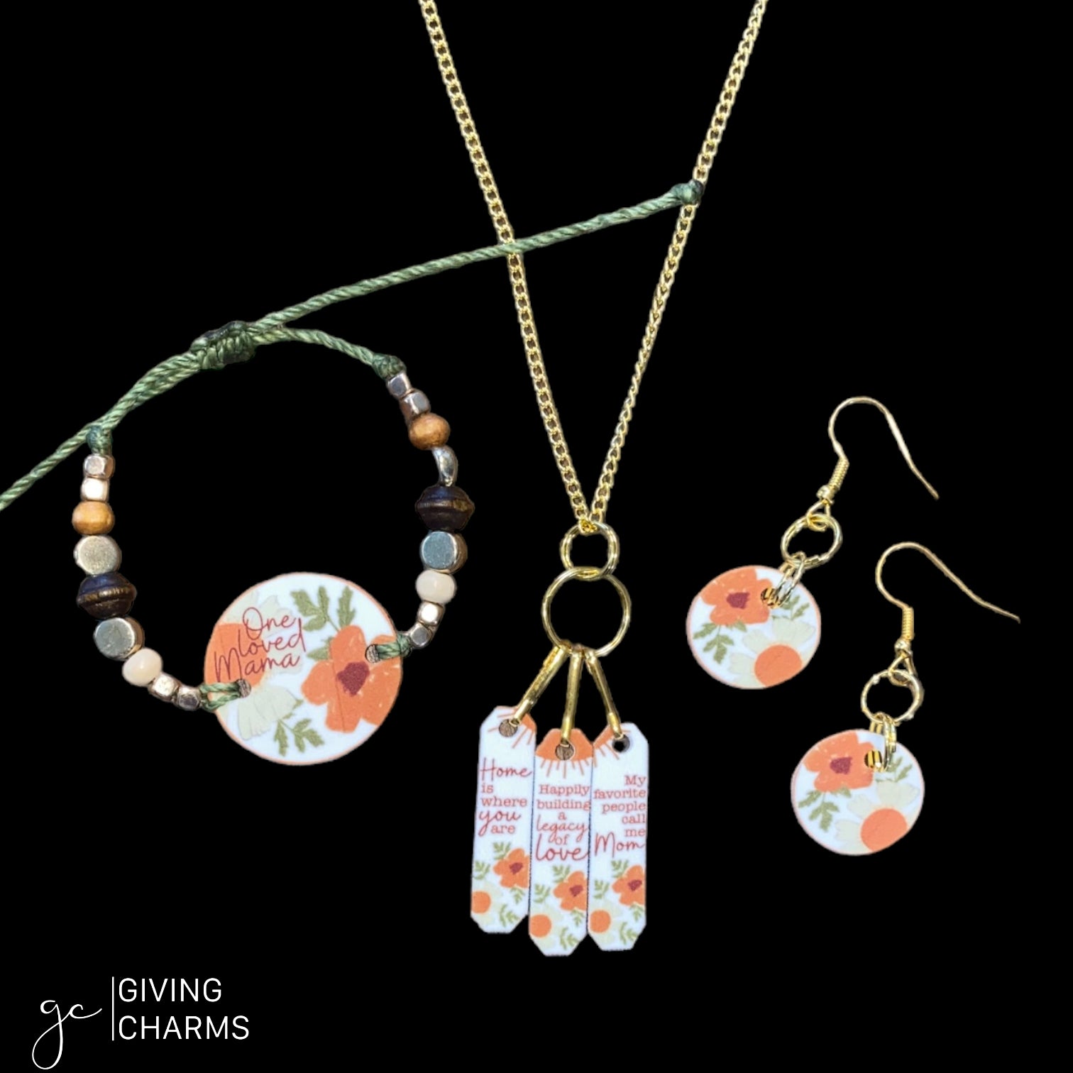 This bracelet is absolutely beautiful in person. Featuring a small circular charm, wooden & golden beads, this is the perfect gift for an important Mom in your life. Beads may vary slightly based on availability. Matching necklace, earrings and bookmarks also available.