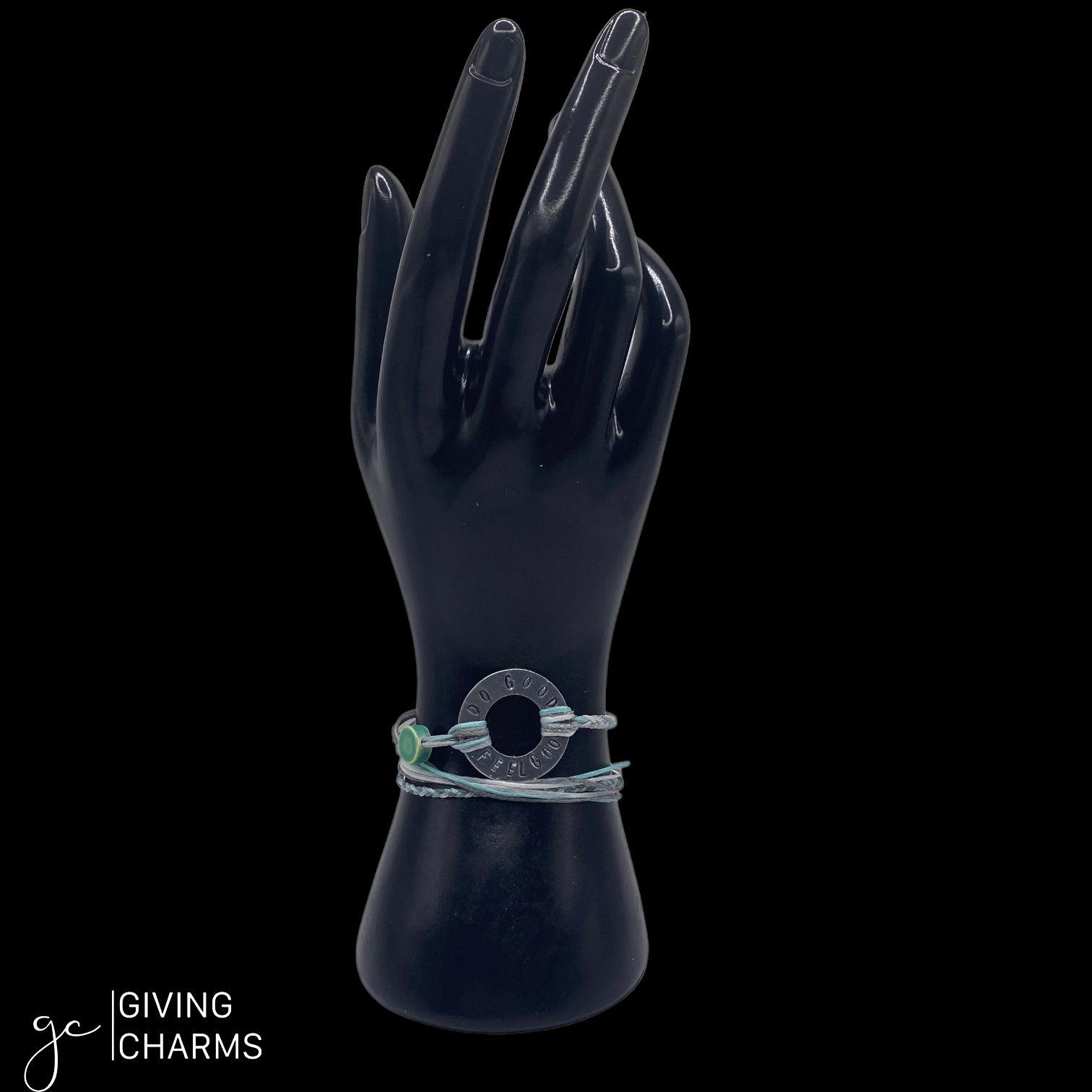 This bracelet set is completely handmade, from the hand-hammered lettering on the washer to the intricate bead placement and braiding. Best of all, the bead on this set acts as a fidget/worry bead, that can be shifted for stress relief. Only ONE available.