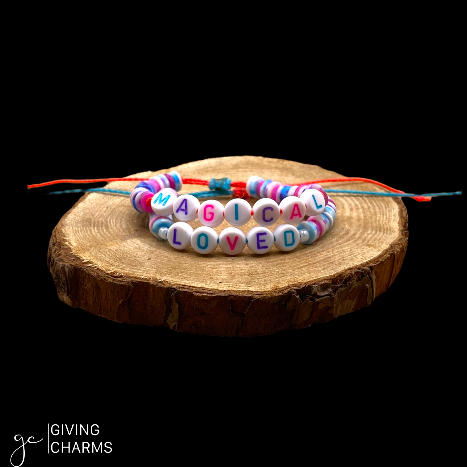 These vibrant adjustable Letter Bead Bracelets fit wrists big or small. Choose your phrase below or request a custom phrase by emailing givingcharms@gmail.com.