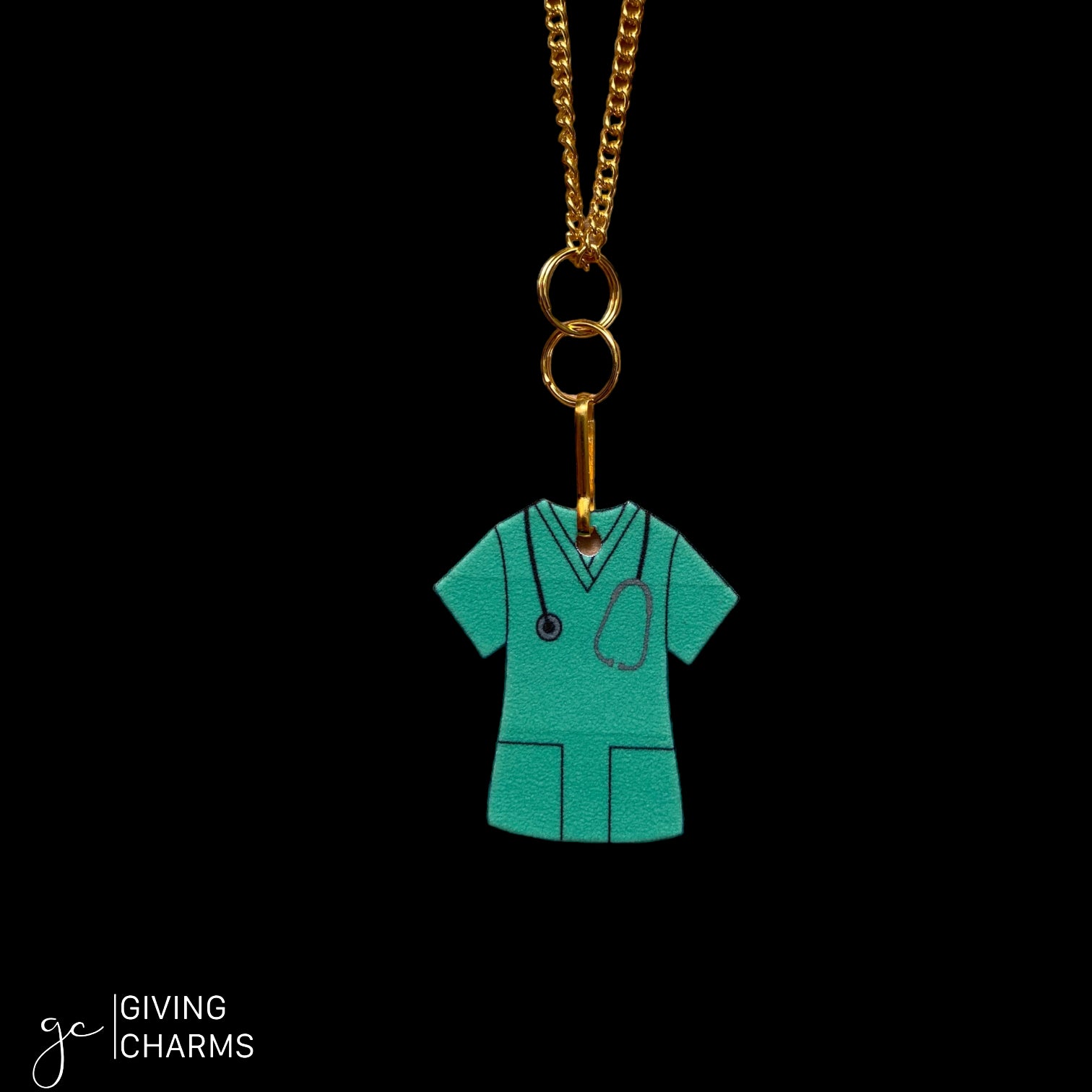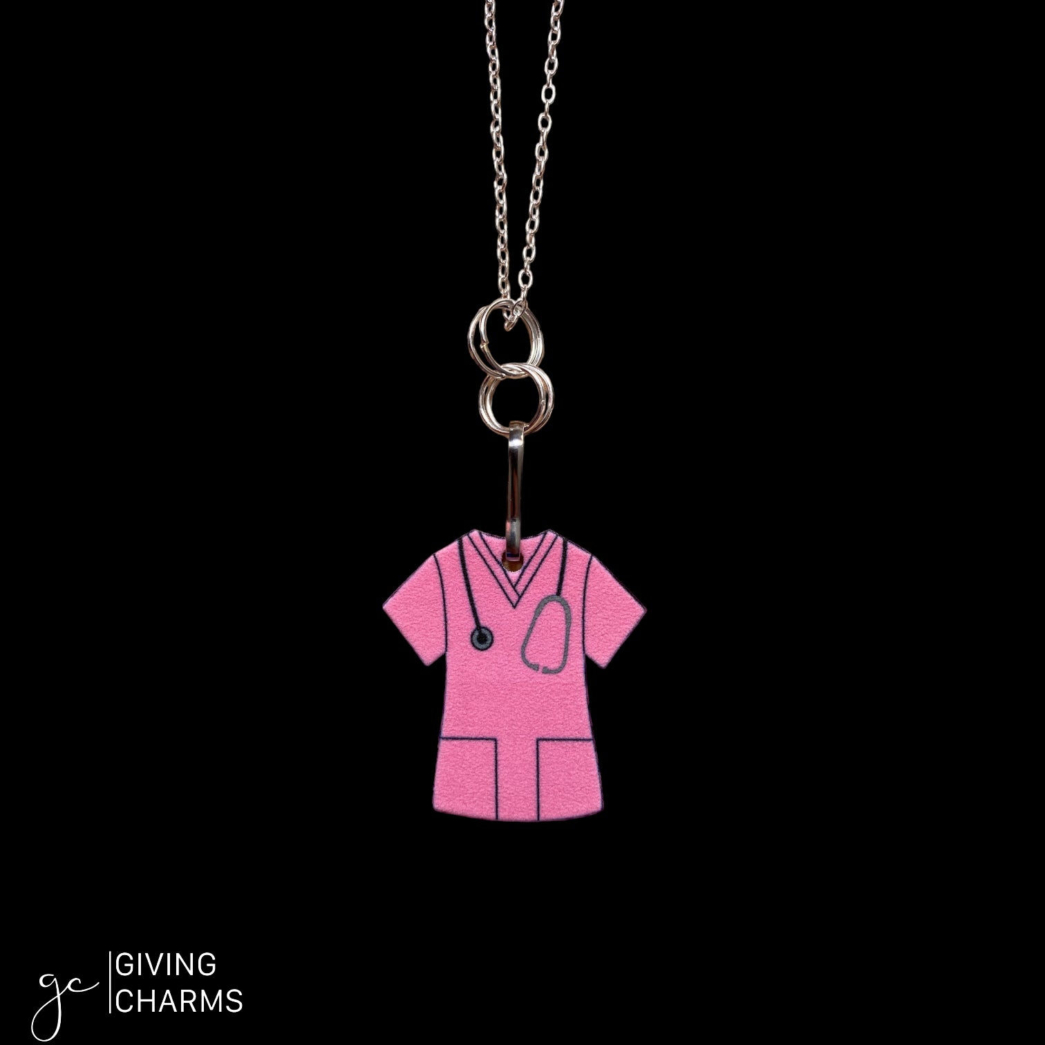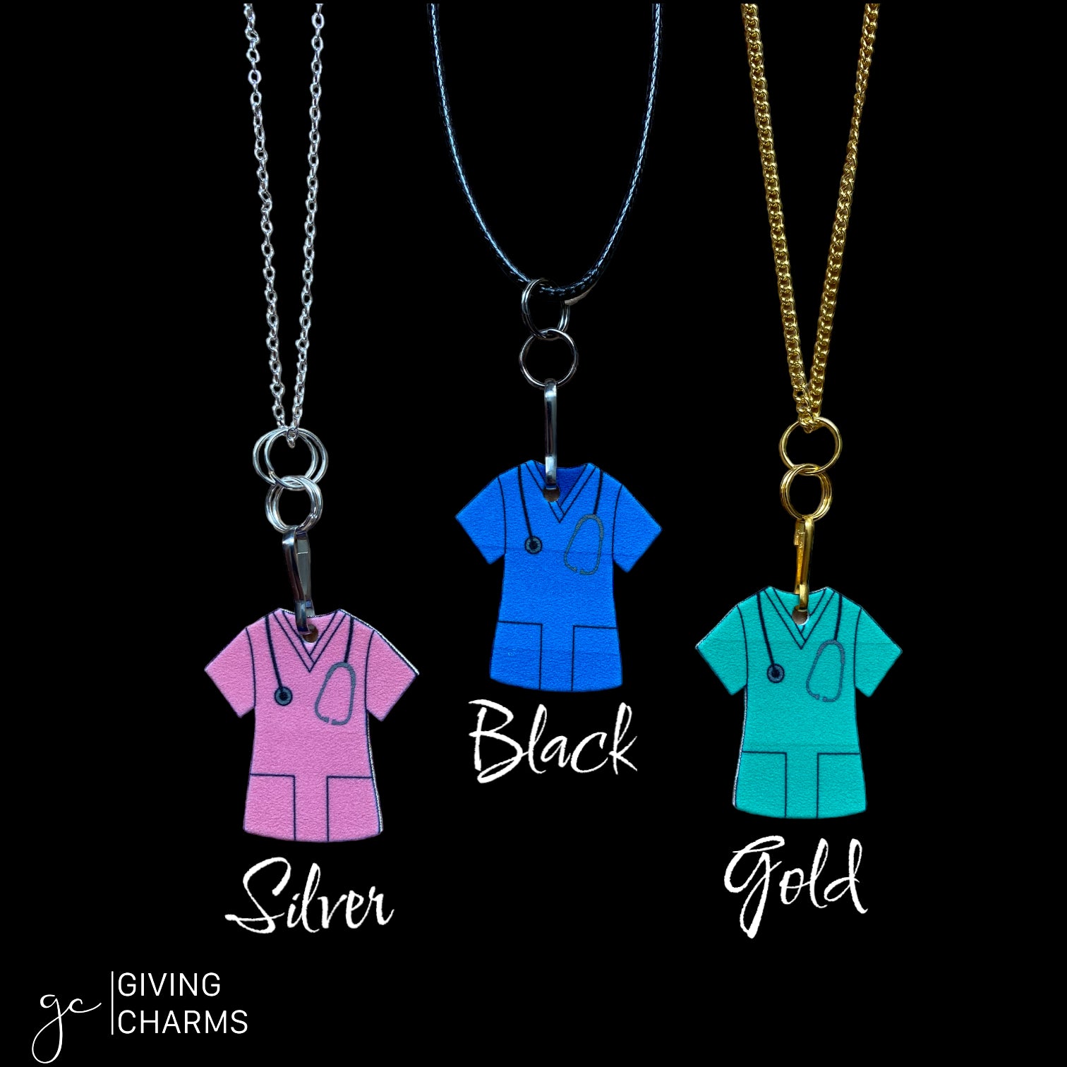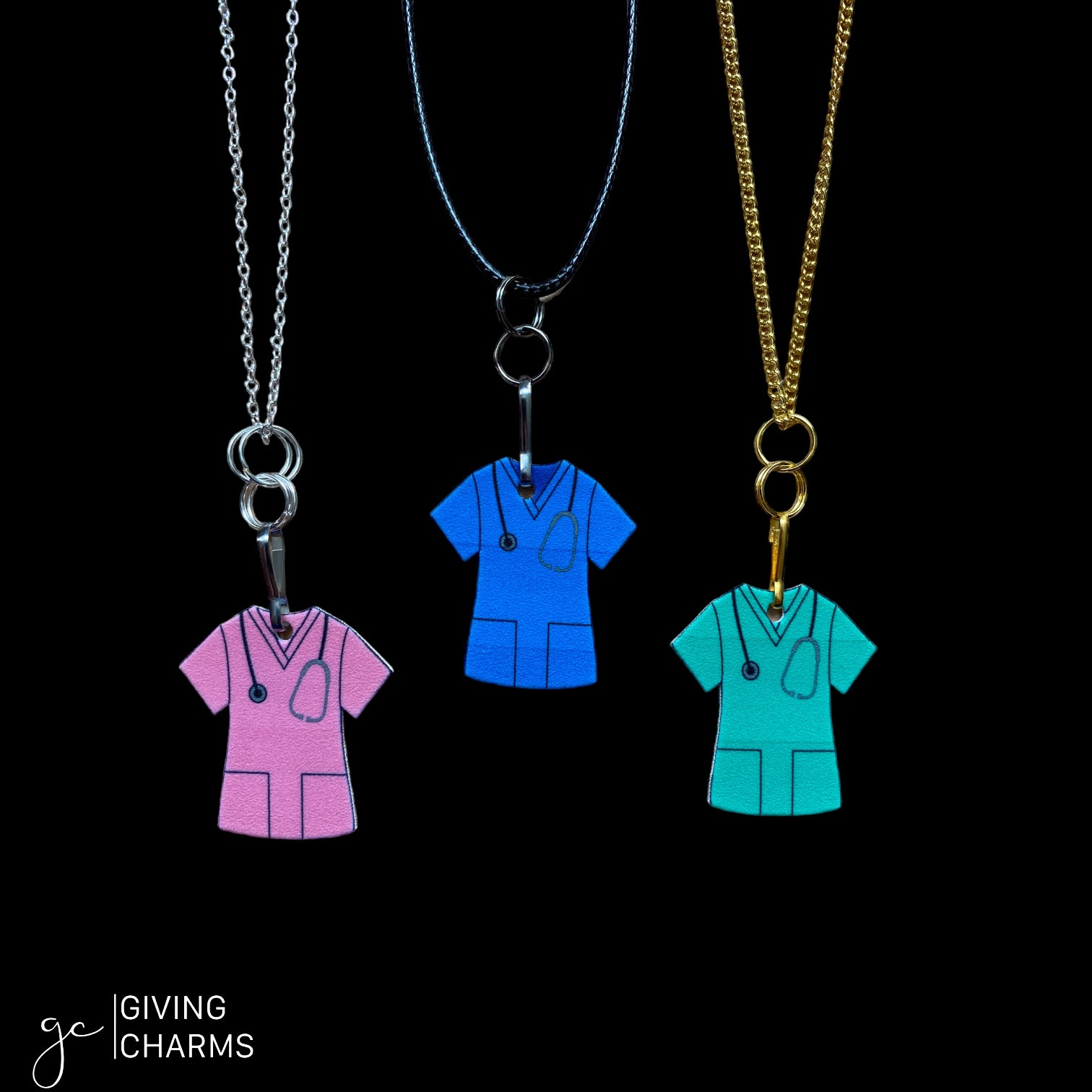 Anyone in the medical field is sure to love this cute necklace! Choose from 3 Scrubs Colors (pink, green, blue) and 3 chain/necklace styles (silver, gold, black). Charms are also removable to wear on your zipper, purse, backpack & more!