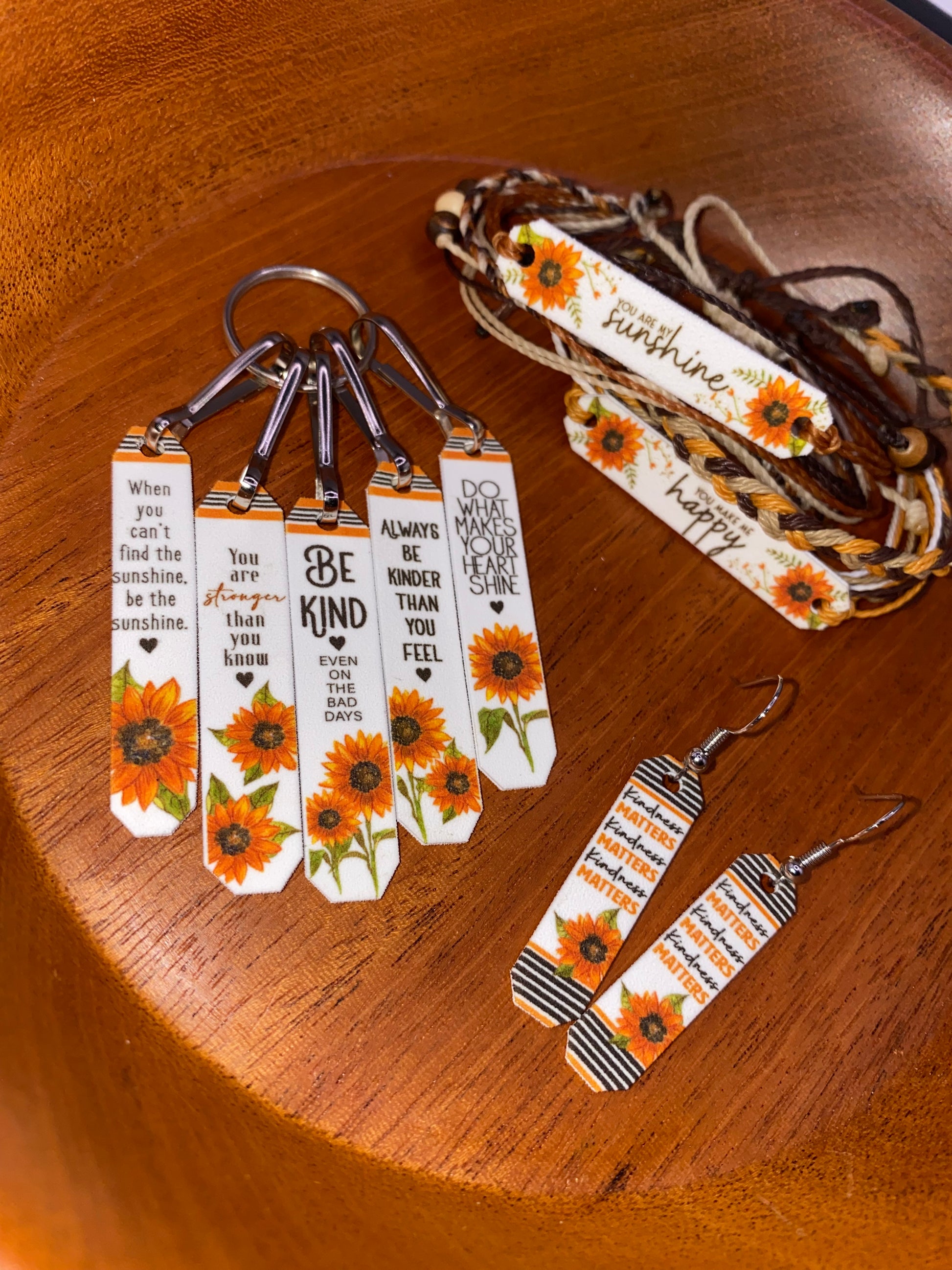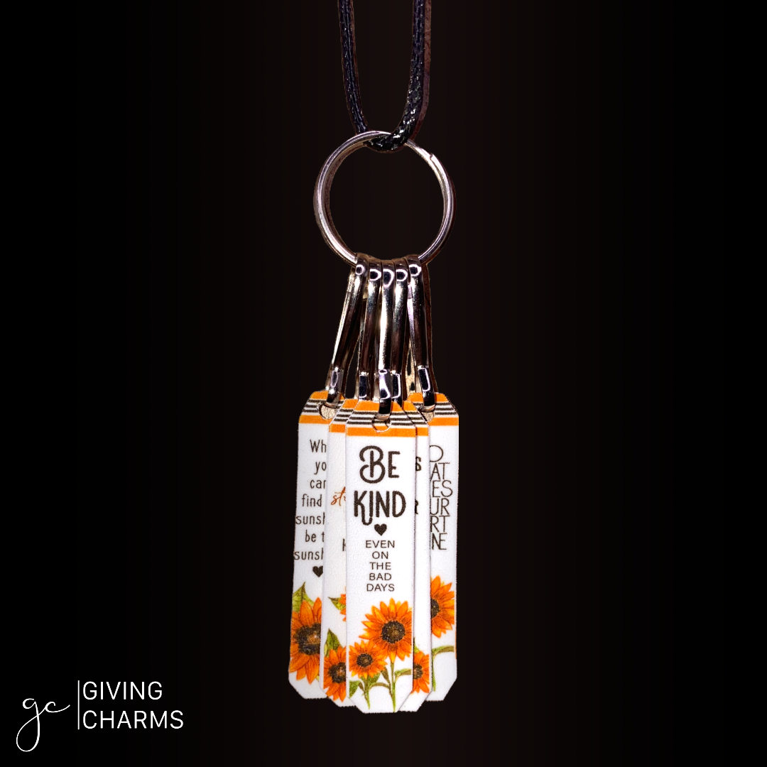 This set features 5 shareable charms attached to a silver loop on a 20" black wax necklace. Matching Charm Strings Bracelets, Earrings & Sticker Charms also available. *Disregard the necklace to use as a keyring!