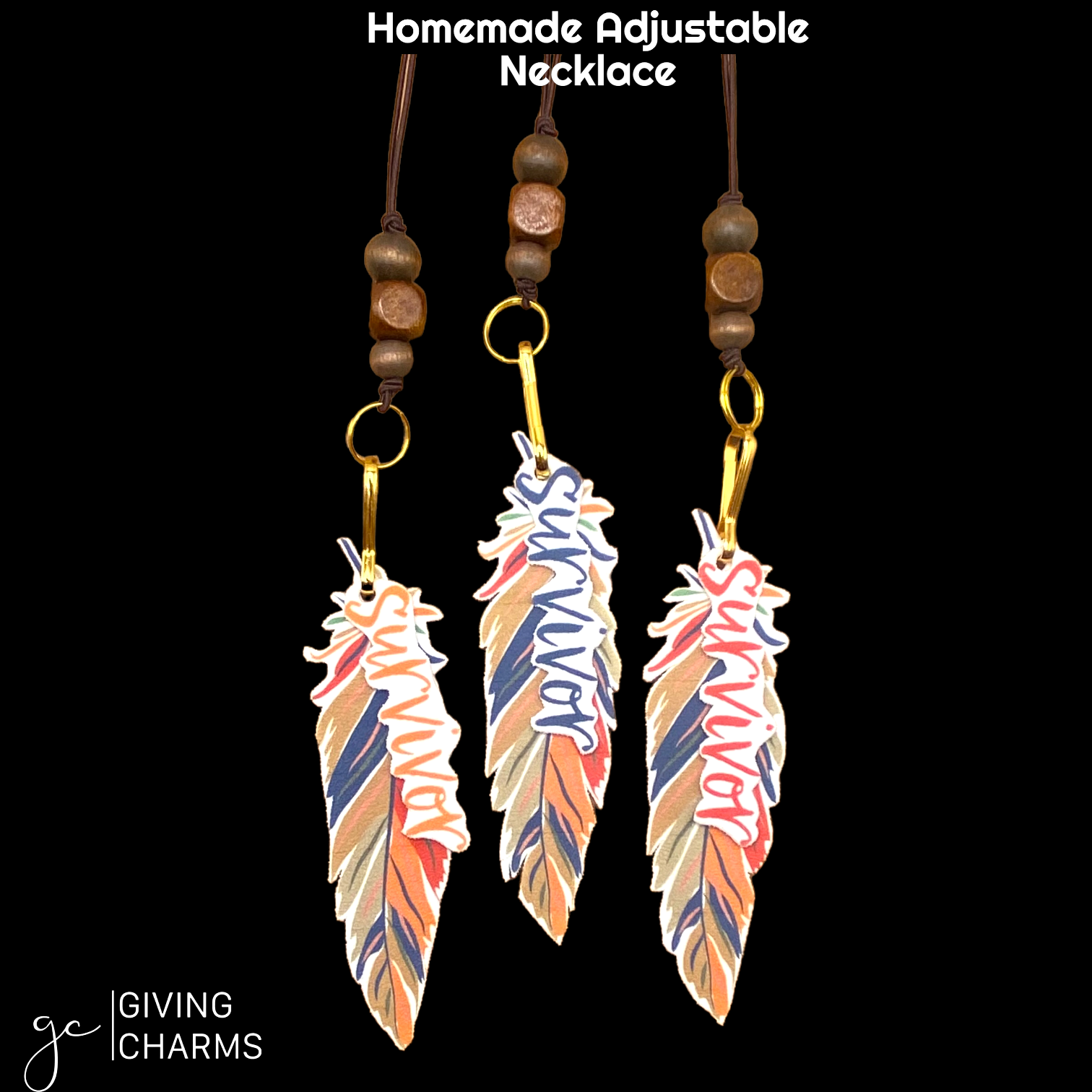 This adjustable "Survivor" necklace features a long brown elastic necklace with 3 wooden beads & a feather/survivor charm. Choose your "survivor" color: