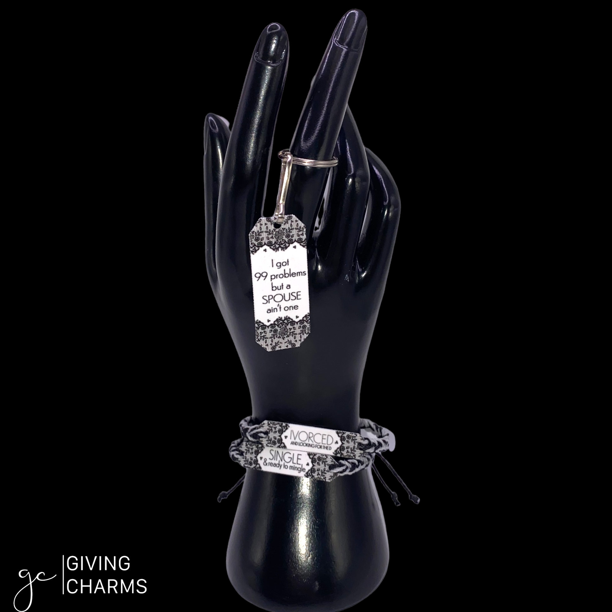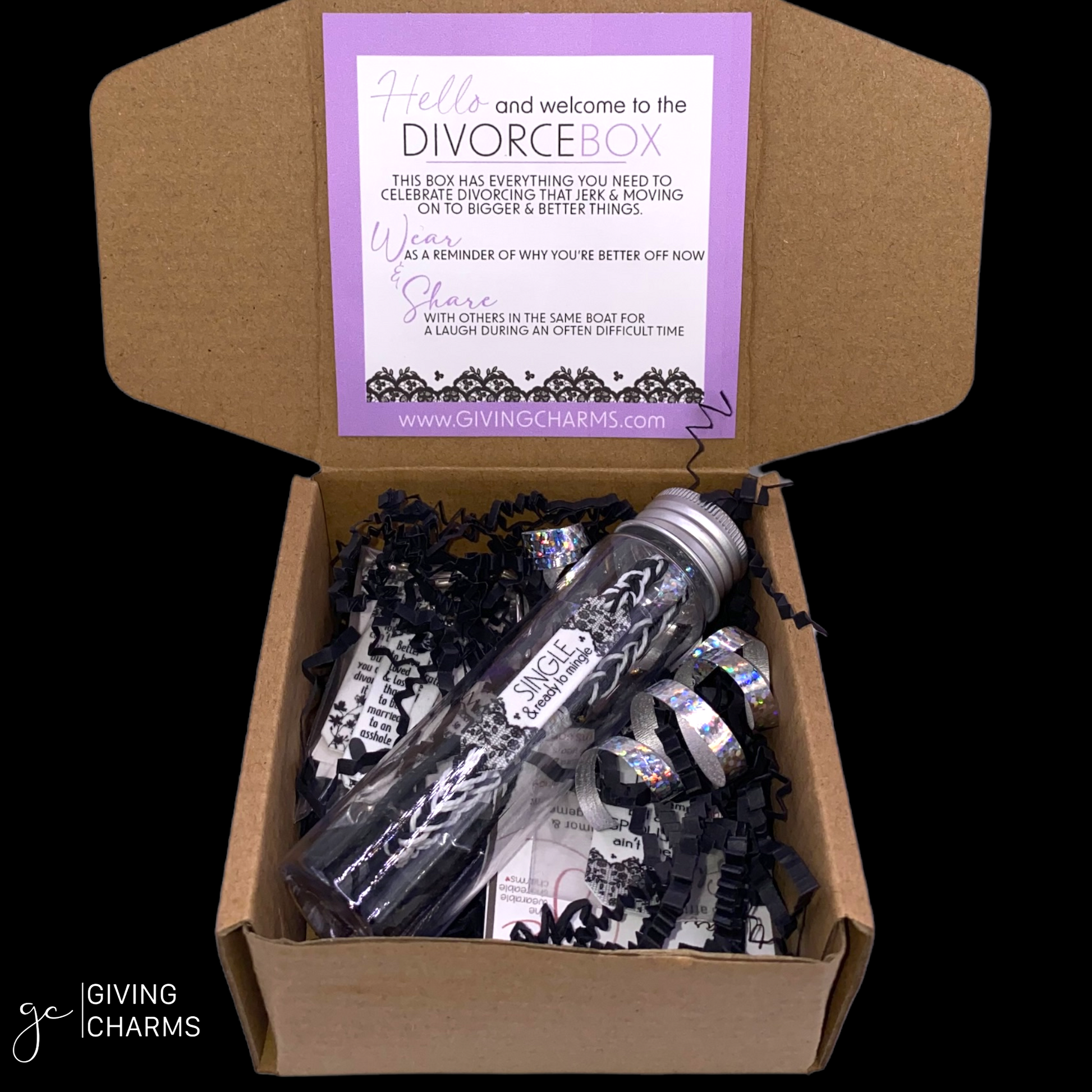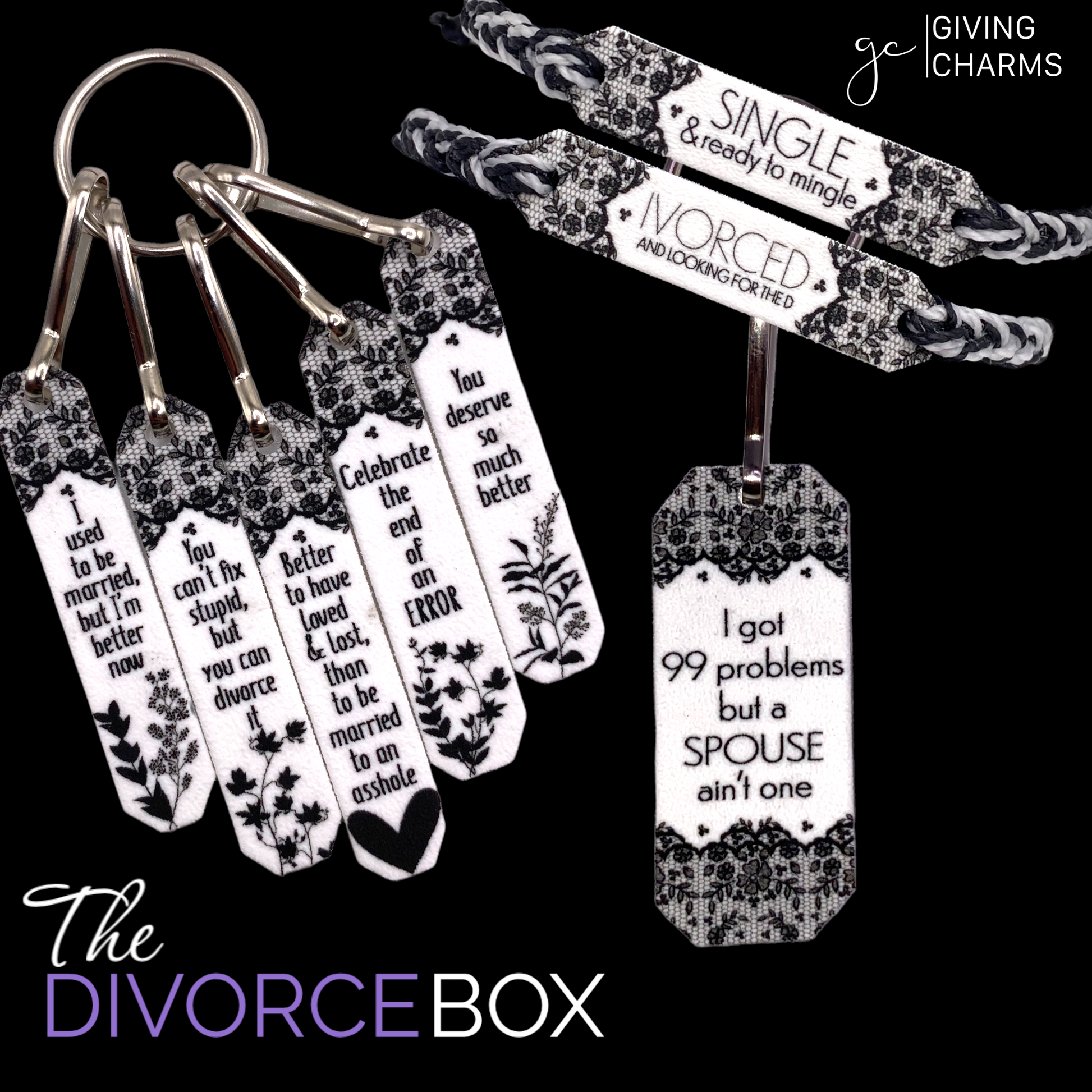 Divorces are hard. And as a friend, it’s our job to make it a little more tolerable. Enter, The Divorce Box. This box features a 5-Charm Wear & Share Necklace, a Keyring, and your choice of Divorce-Themed Braided Charm Strings Bracelets.