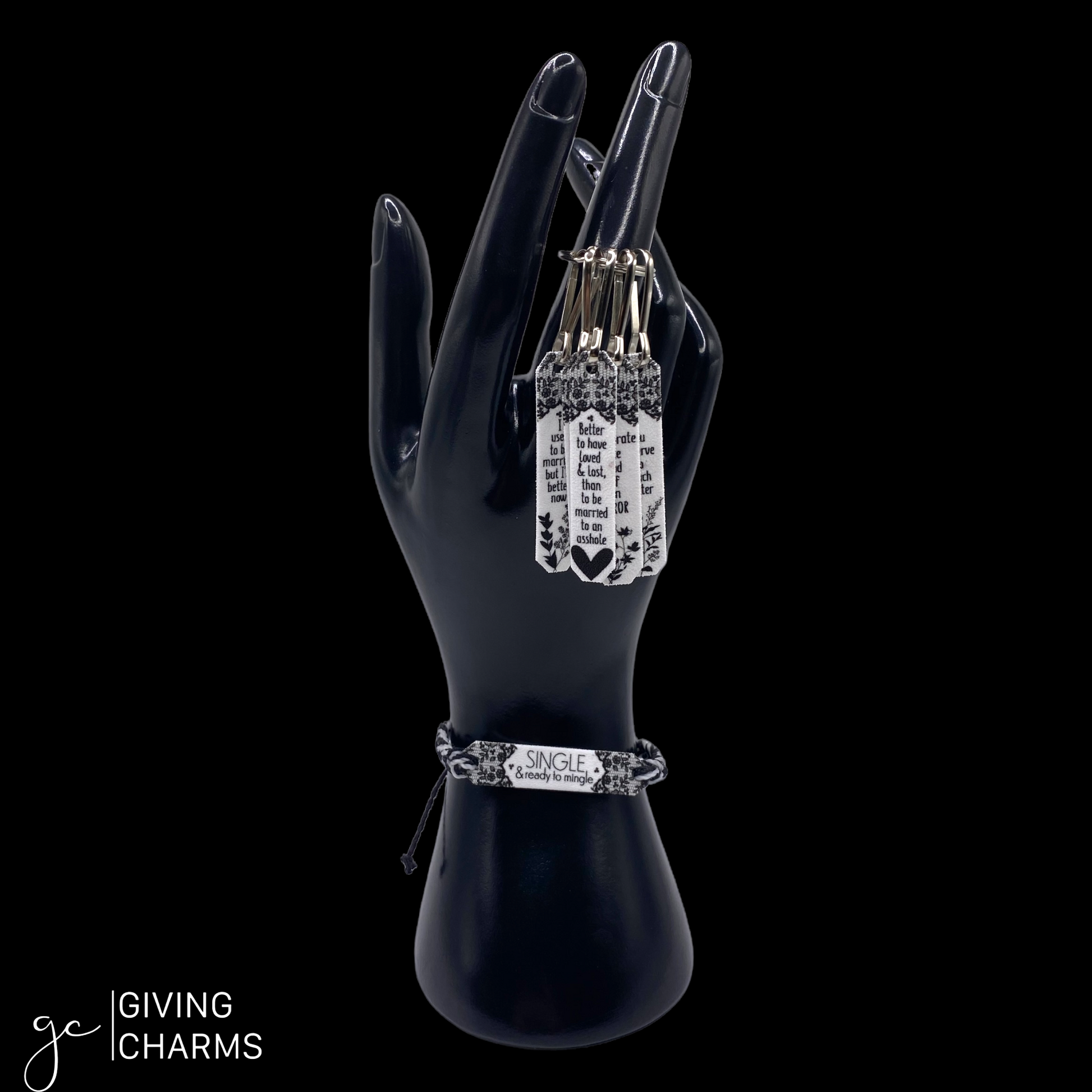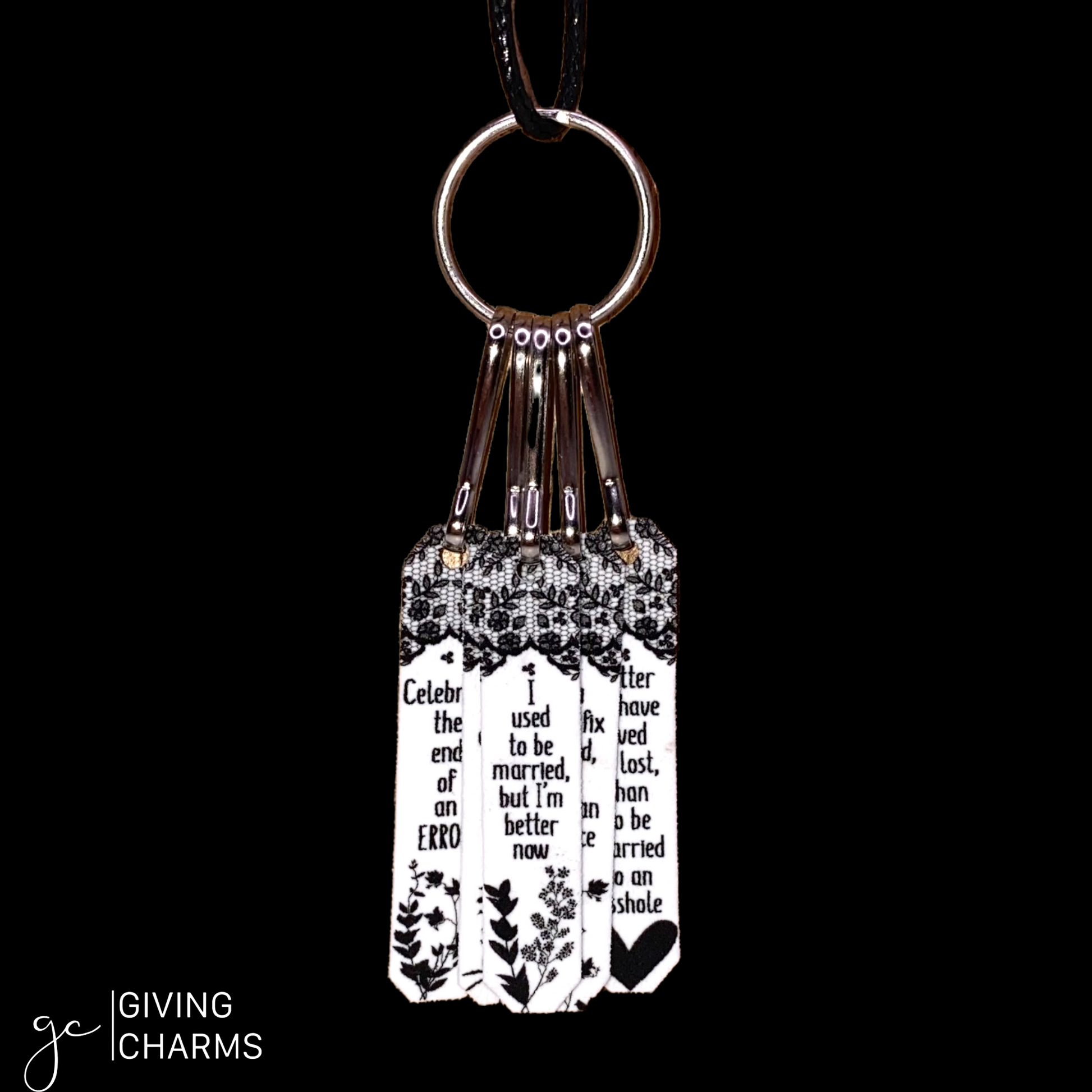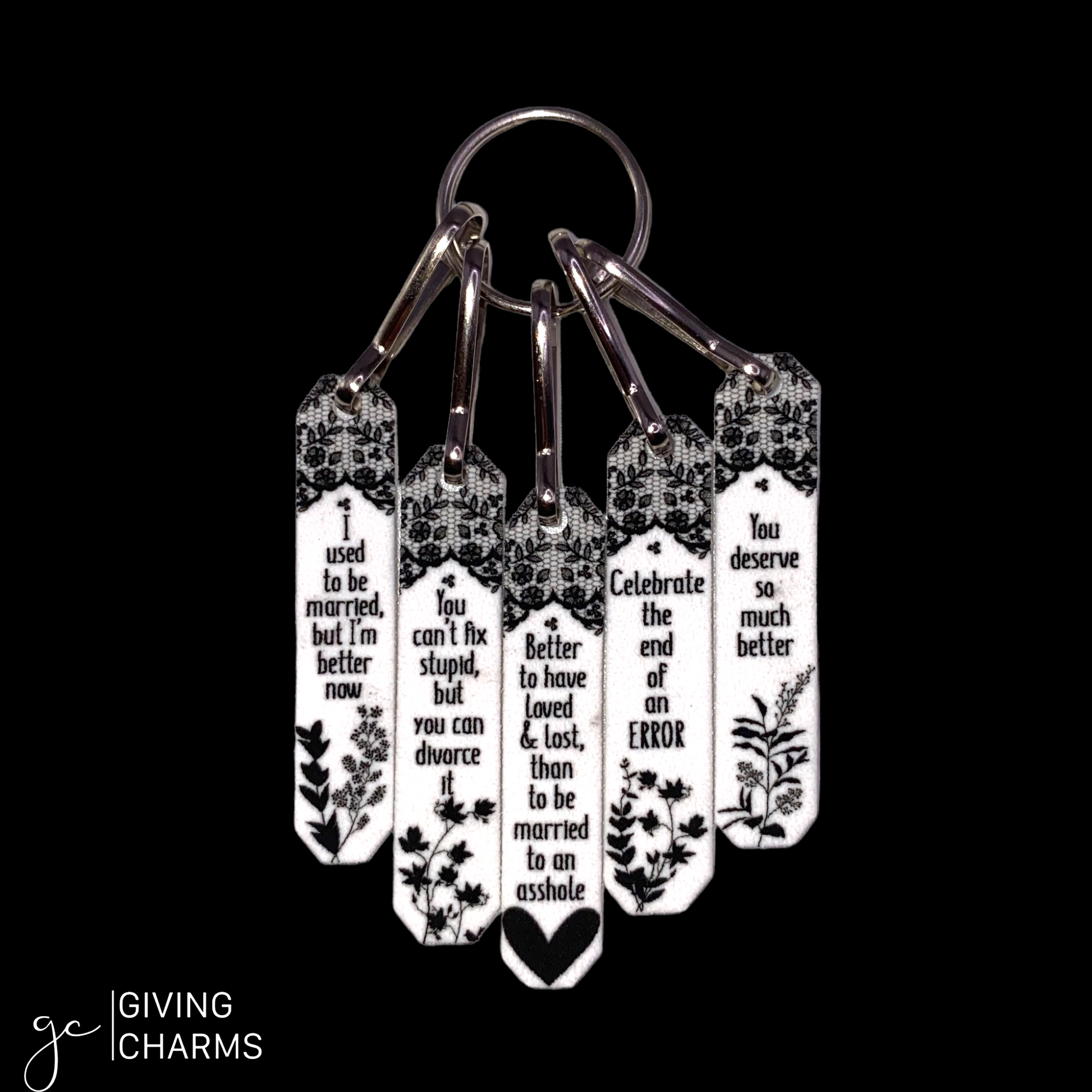 Divorces are hard. And as a friend, it’s our job to make it a little more tolerable. Enter, The Divorce Box. This box features a 5-Charm Wear & Share Necklace, a Keyring, and your choice of Divorce-Themed Braided Charm Strings Bracelets.