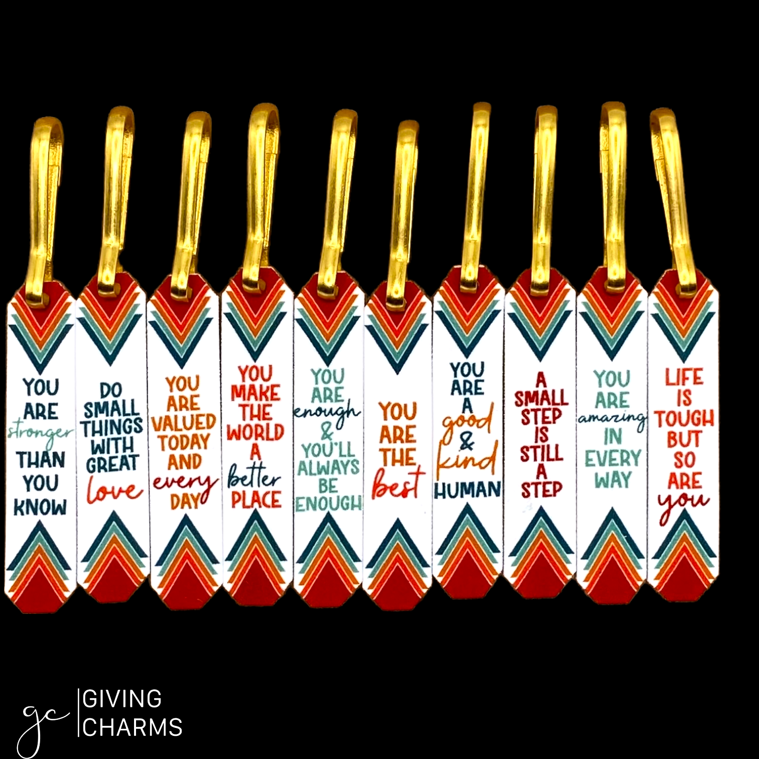 This set features 10 wear & share charms in a convenient tin, great for your purse, car or desk! Wear charms on your backpack, zipper, purse, necklace, etc. Great for TIPPING!