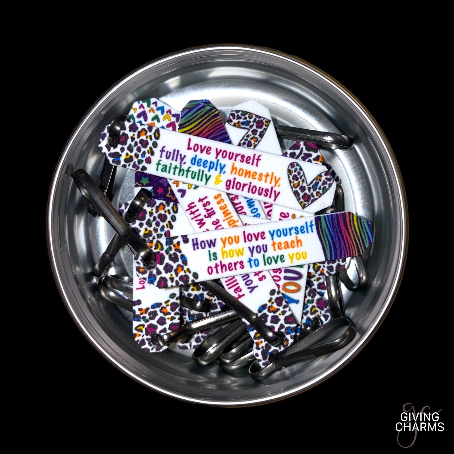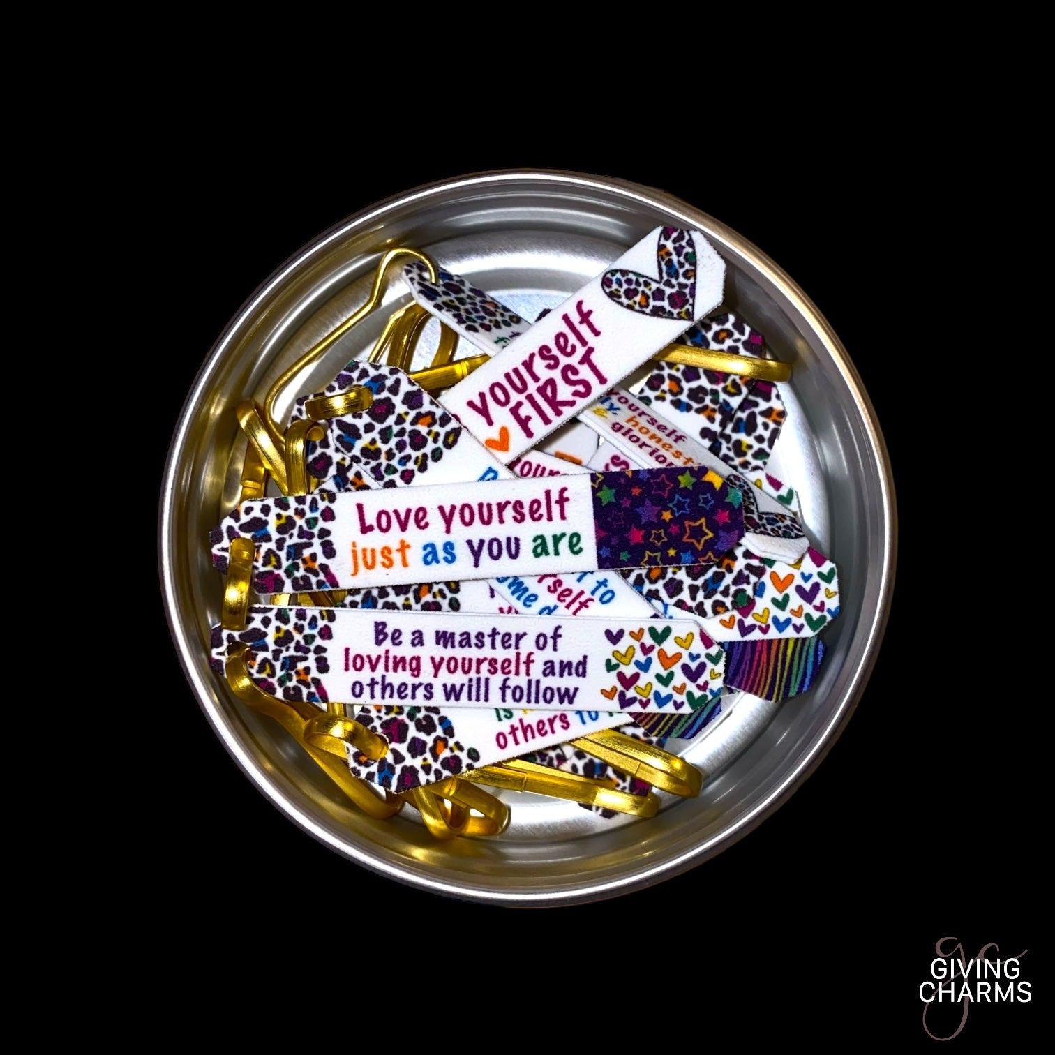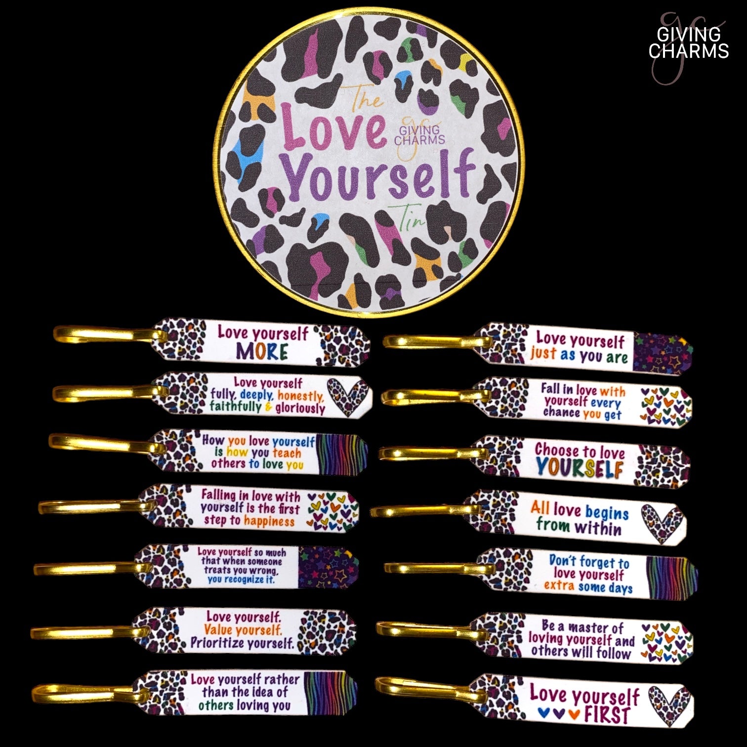 This tin features 14 Wear & Share Charms, each with a special reminder to love yourself. Great for Valentine’s Day & beyond. Choose your clip style: Gold or Gun Metal.