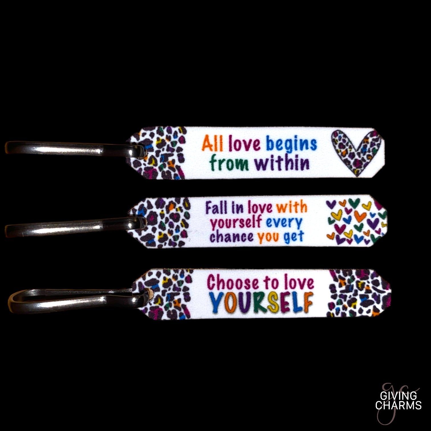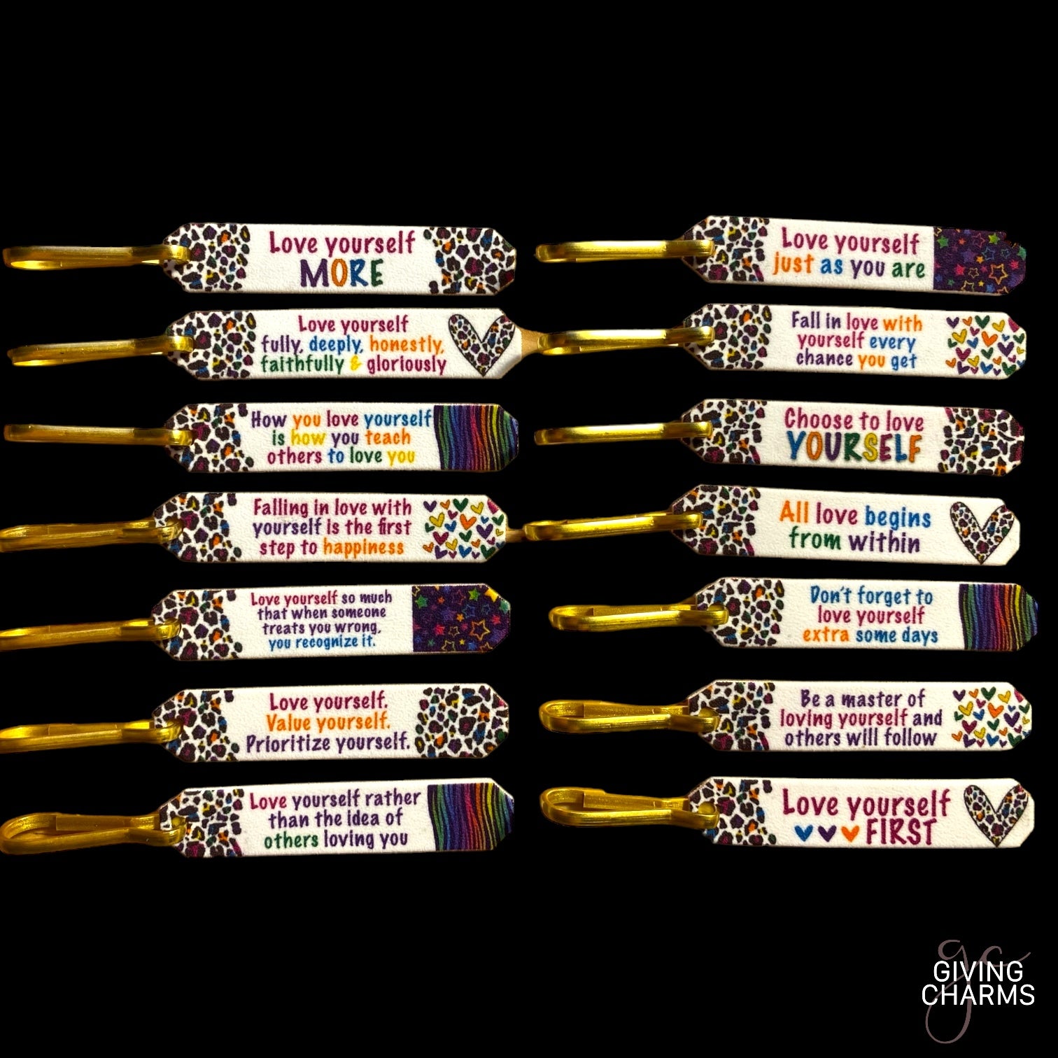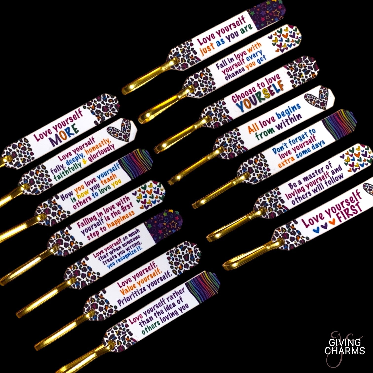 This tin features 14 Wear & Share Charms, each with a special reminder to love yourself. Great for Valentine’s Day & beyond. Choose your clip style: Gold or Gun Metal.