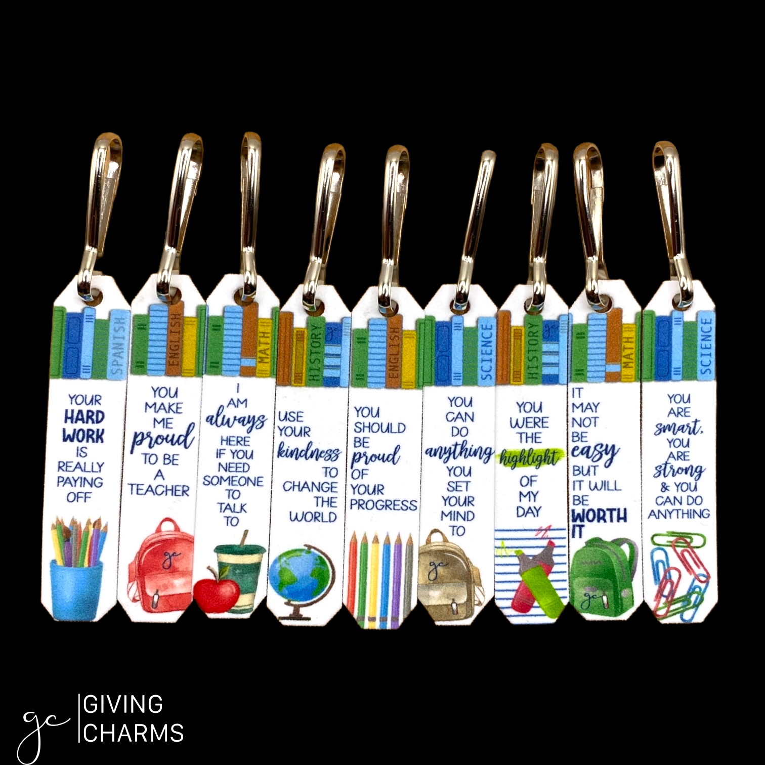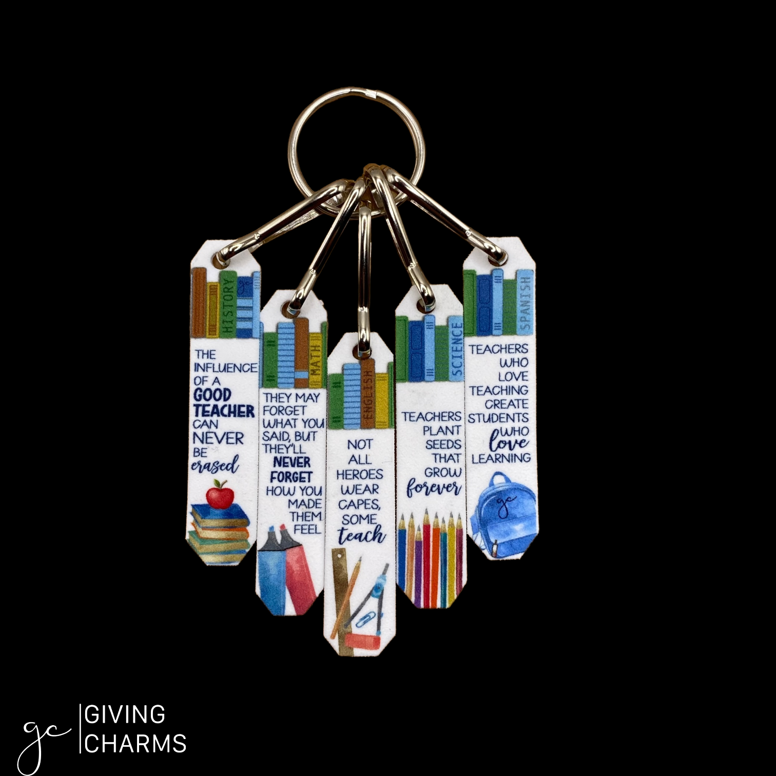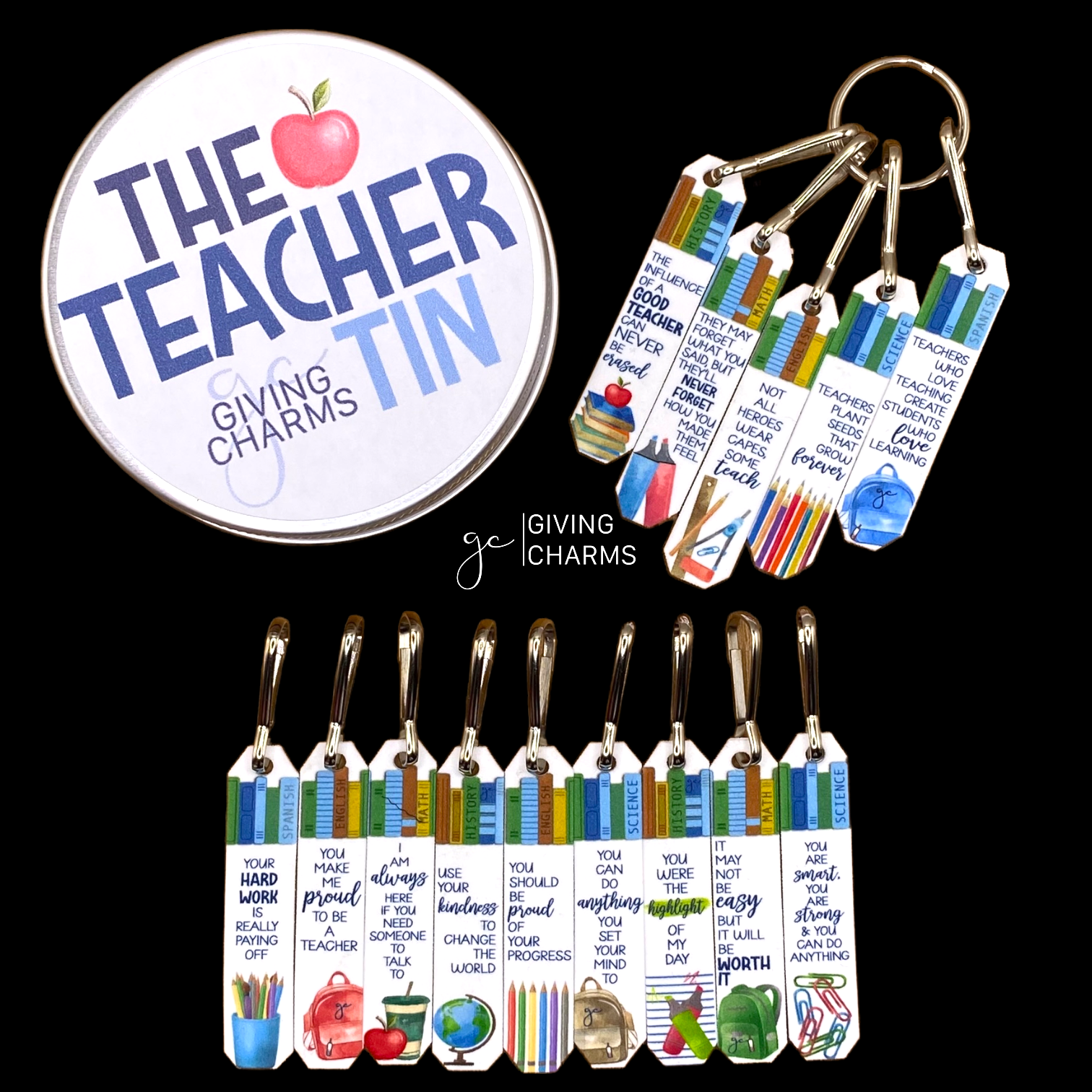 The *perfect* gift for a Teacher. This Teacher Tin features 14 individual charms in a tin with a Keyring - perfect to bring to school & share with students and fellow teachers.