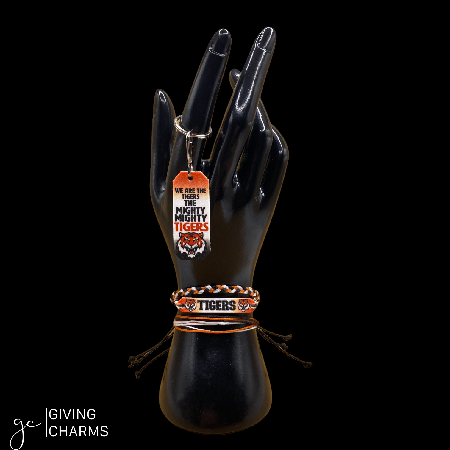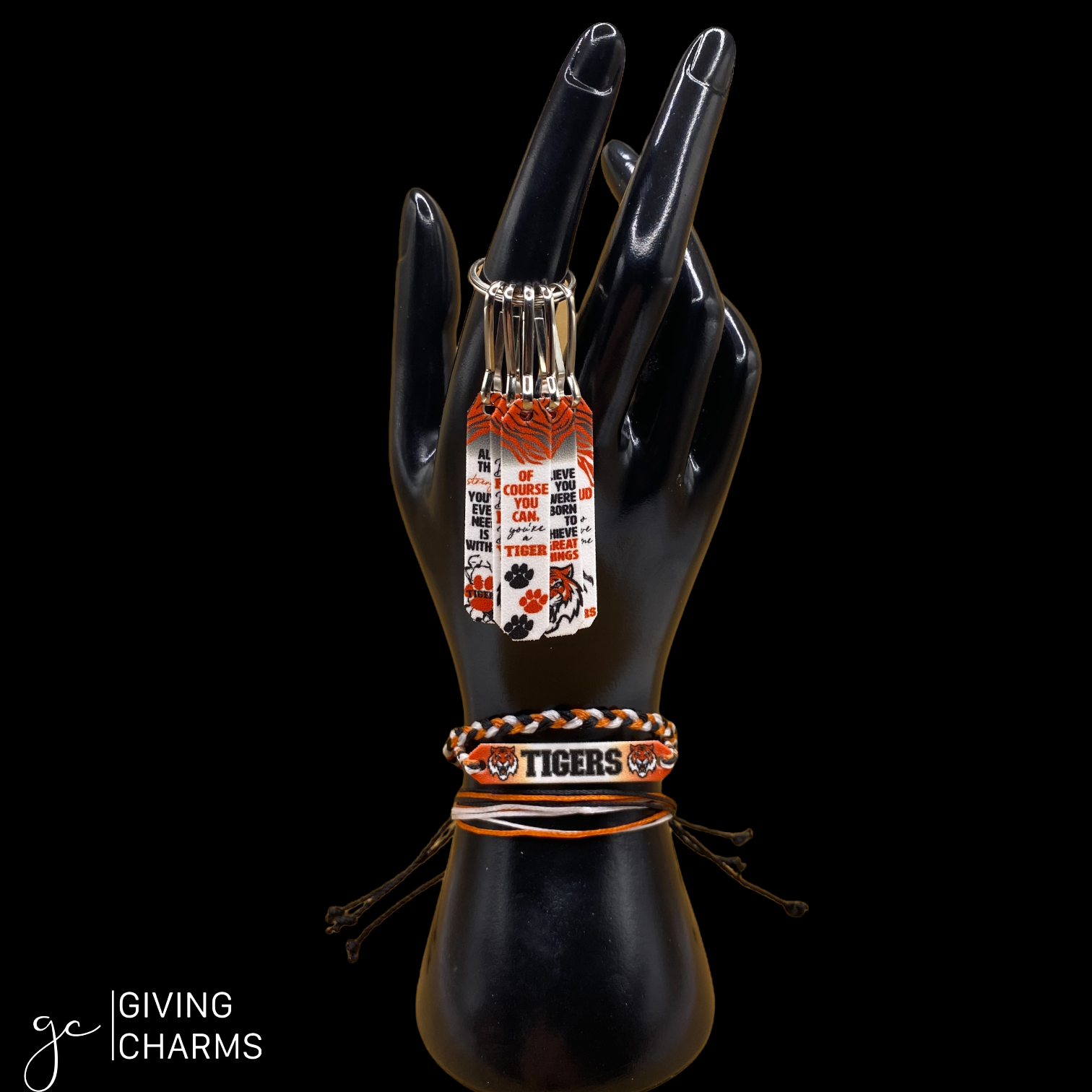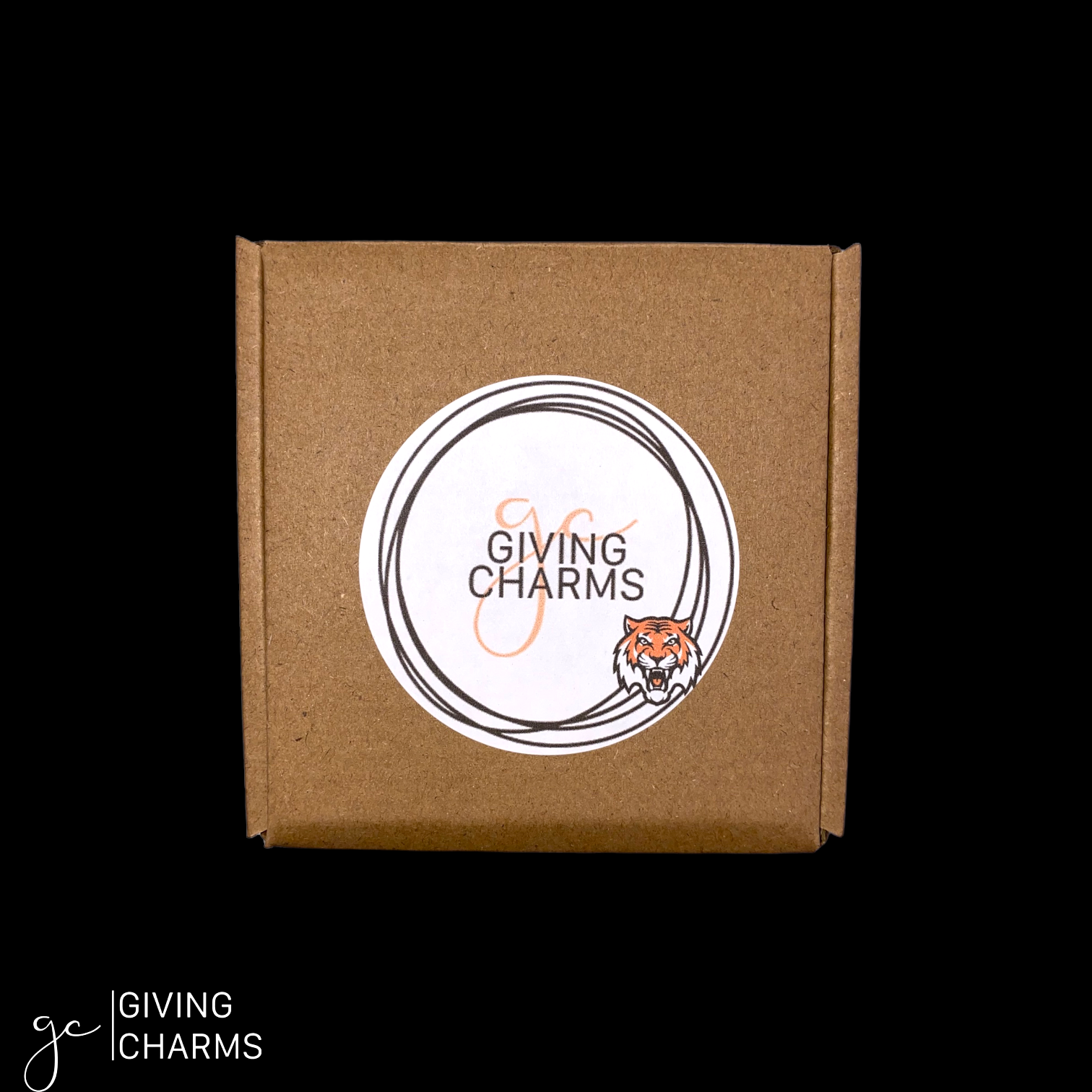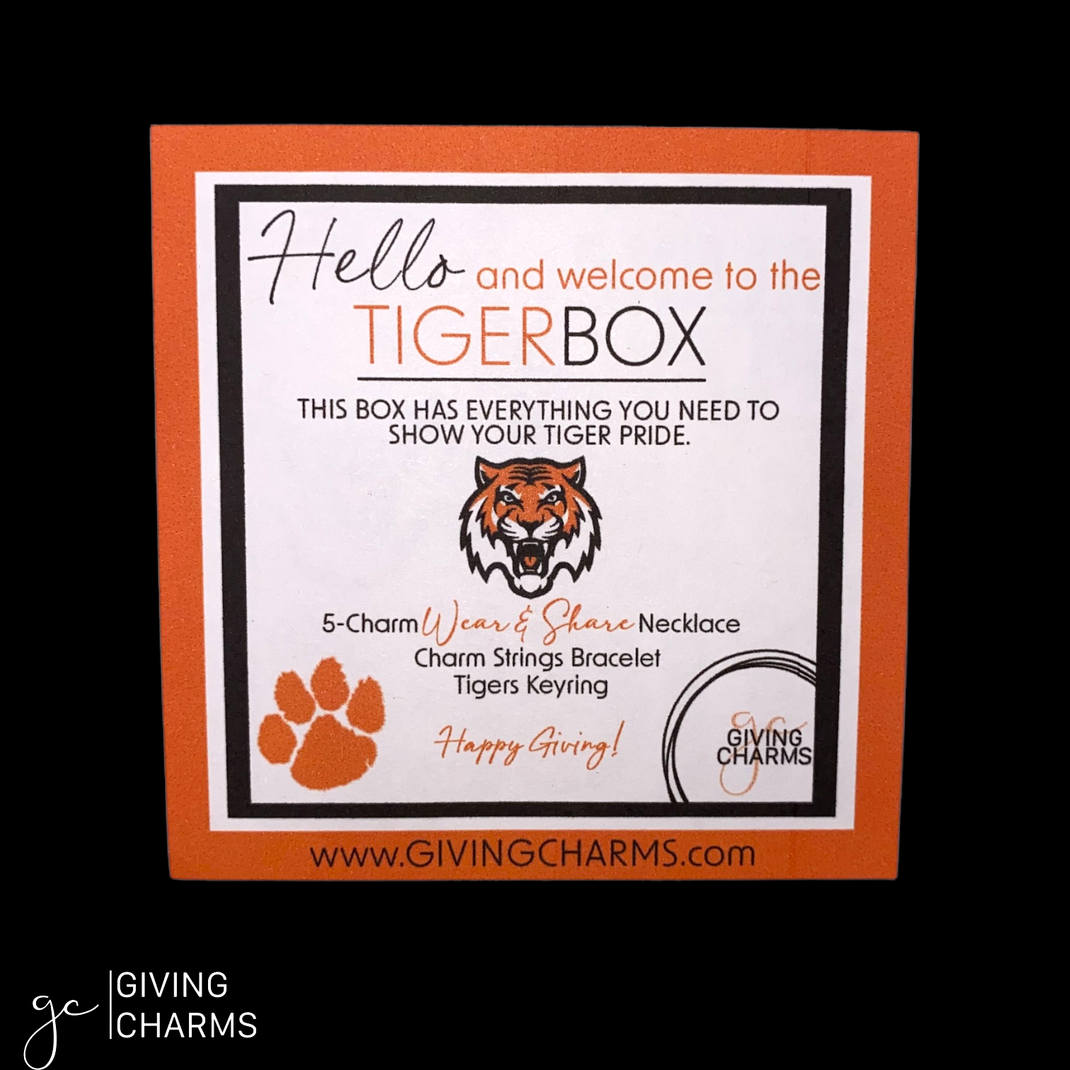 I will ALWAYS feature a Tiger set because…Once a Tiger, ALWAYS a Tiger. This box is PERFECT for your Farmington Tiger (or any other Tigers out there)! This TIGER Box features a 5-Charm Wear & Share Necklace, Tiger Keyring, and your choice of a Tiger-themed Braided Charm Strings Bracelet.