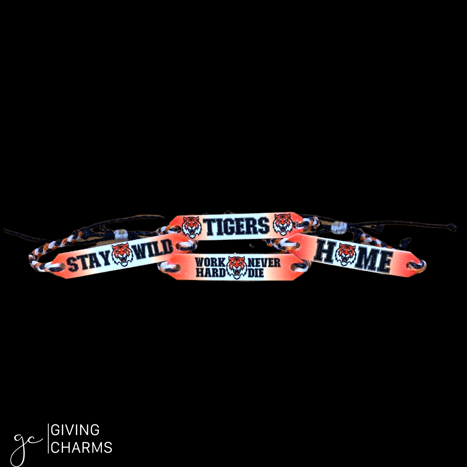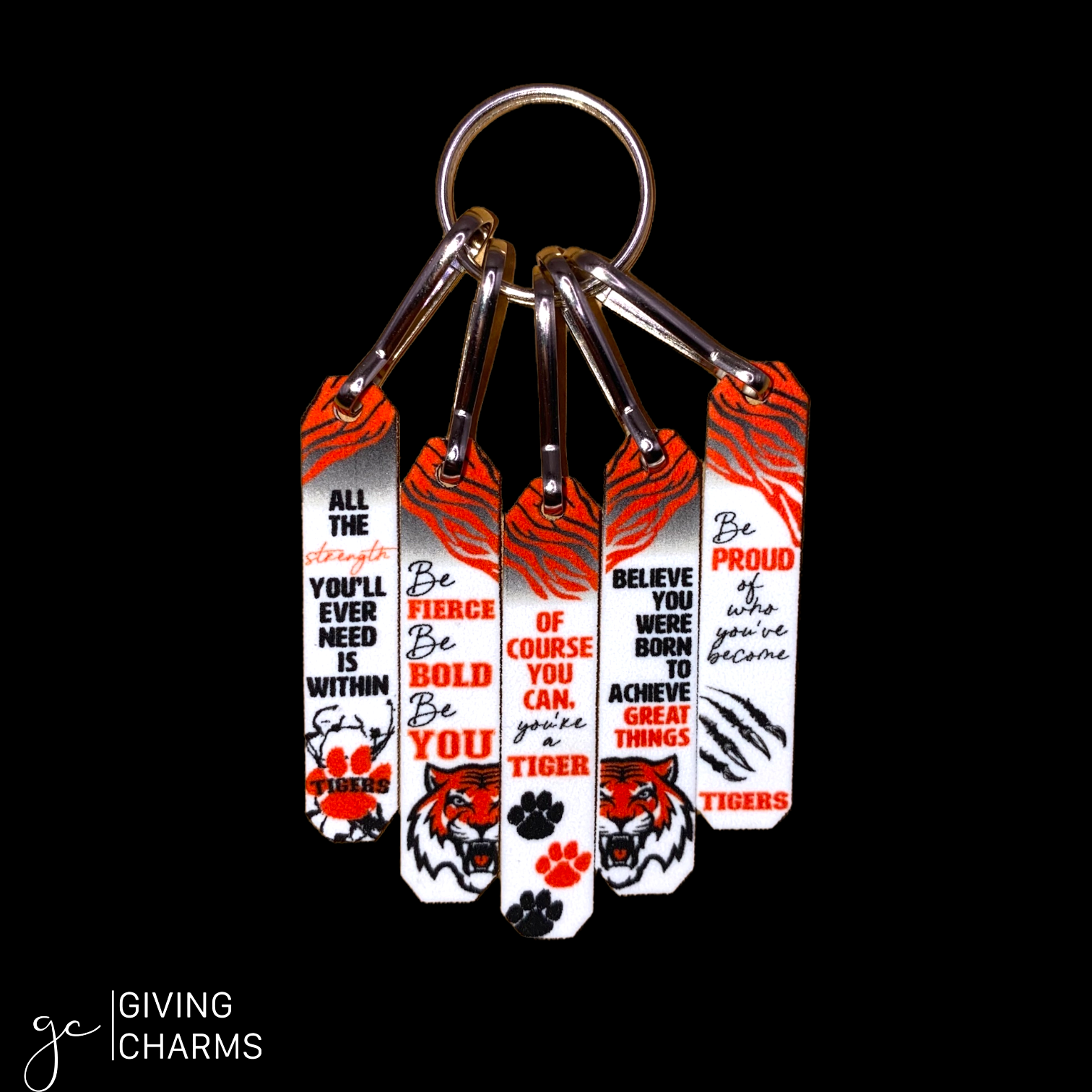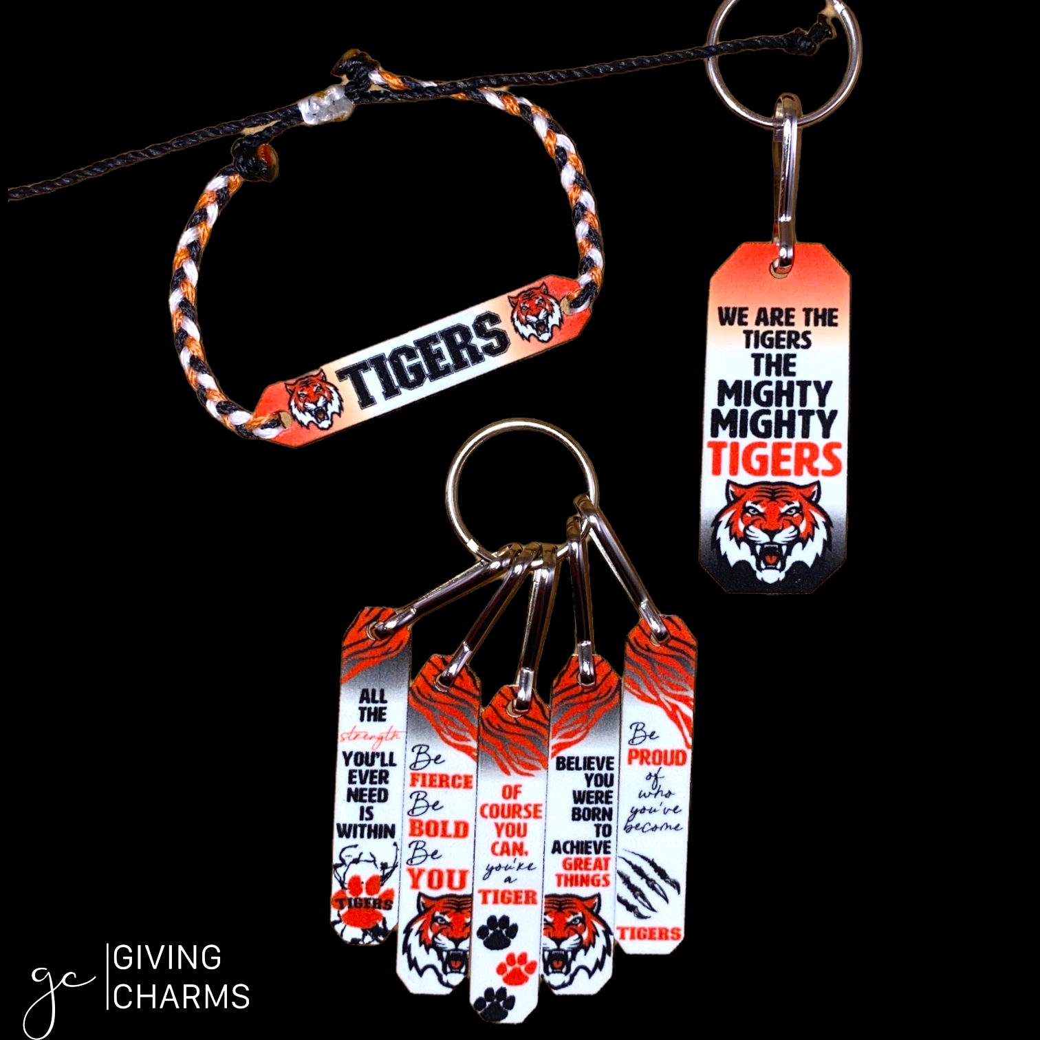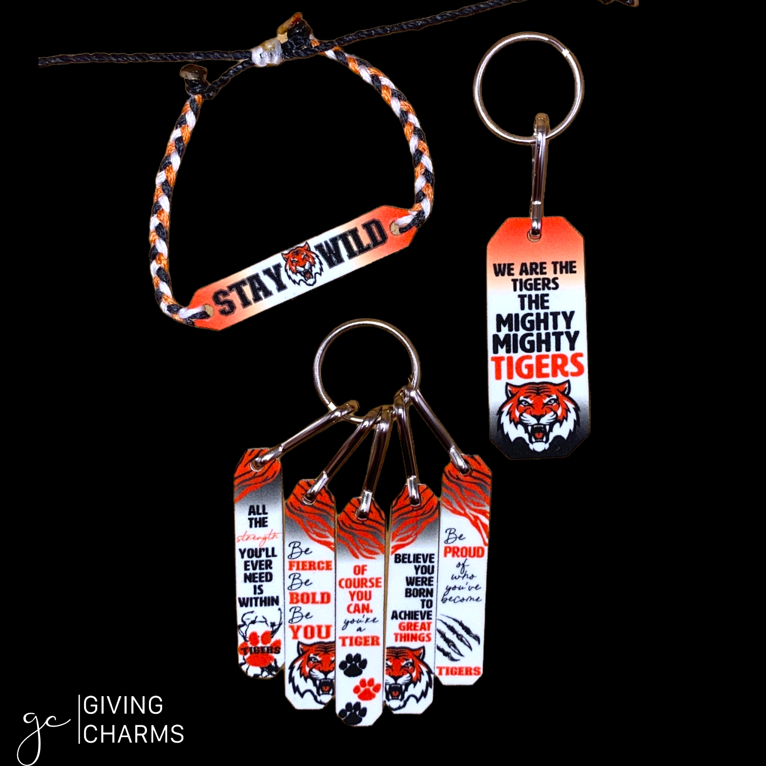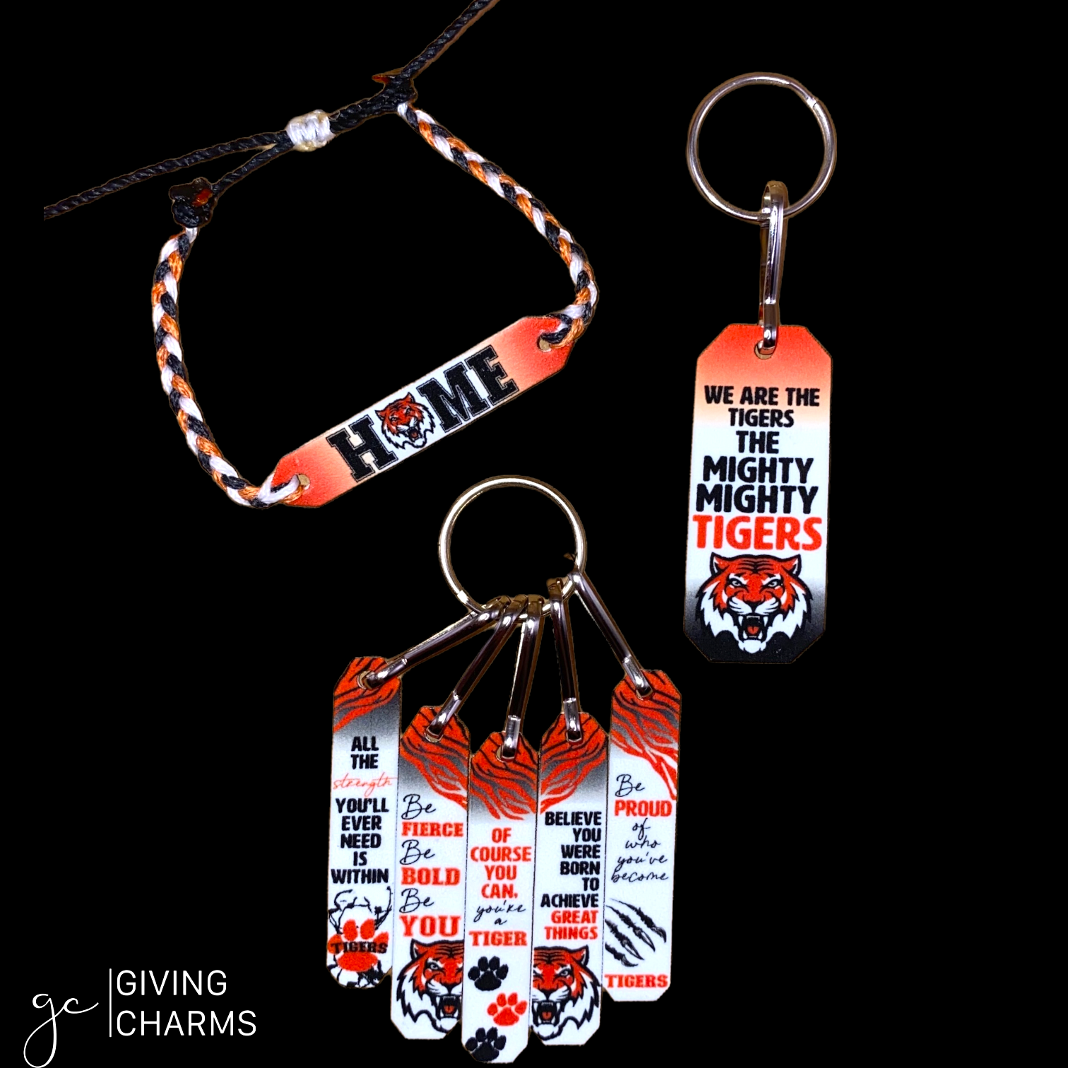 I will ALWAYS feature a Tiger set because…Once a Tiger, ALWAYS a Tiger. This box is PERFECT for your Farmington Tiger (or any other Tigers out there)! This TIGER Box features a 5-Charm Wear & Share Necklace, Tiger Keyring, and your choice of a Tiger-themed Braided Charm Strings Bracelet.